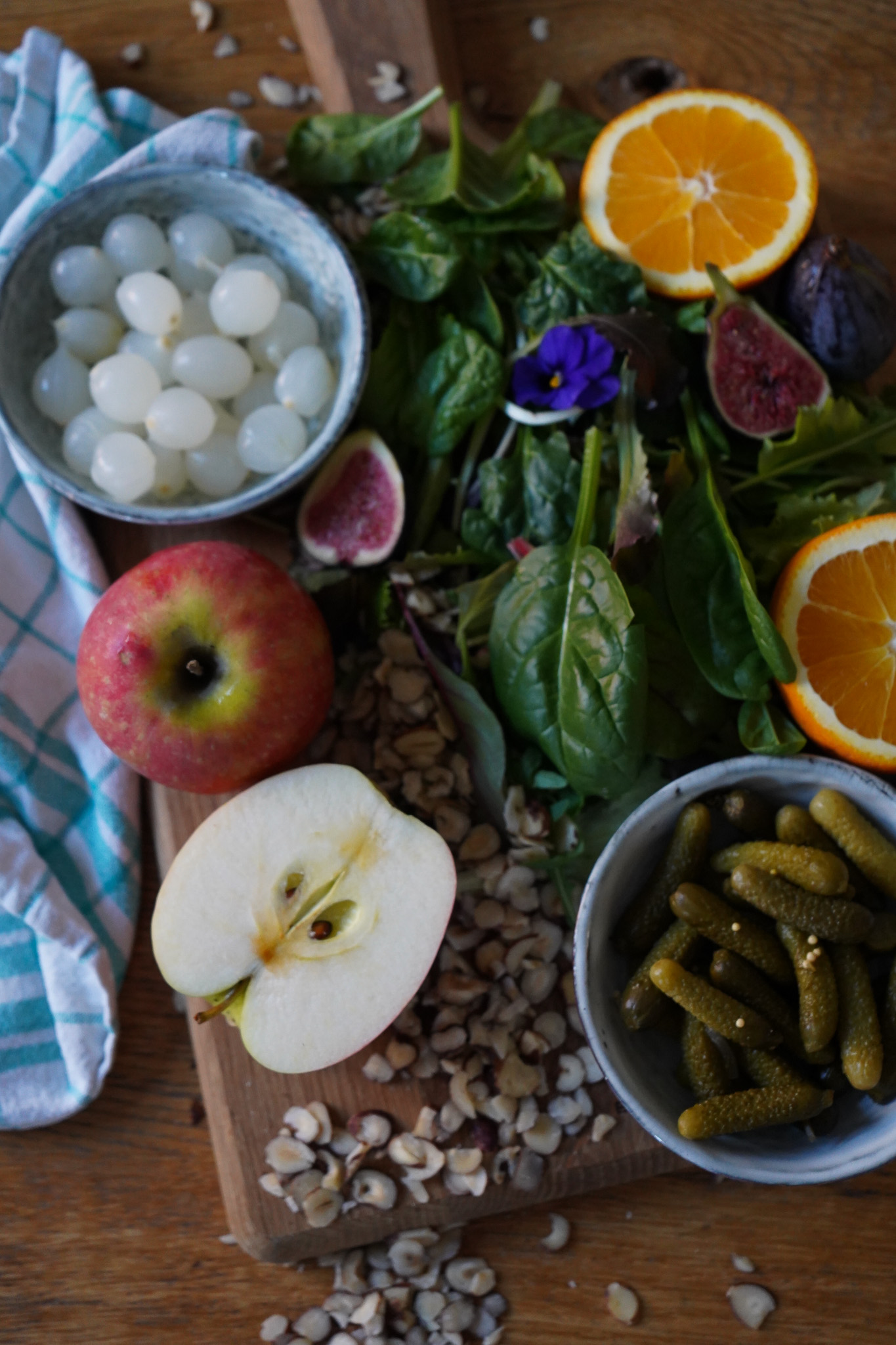 Für das Mise en place die Blattsalate waschen und lesen. Äpfel und Feigen waschen. Äpfel in kleine Würfel schneiden. Feigen halbieren. Perlzwiebeln und Gürkchen abgießen und abtropfen lassen. Orangen mit einem scharfen Messer schälen und die Filets aus der weißen Haut schneiden. Den Saft, wenn möglich, auffangen – ich empfehle deshalb ein Schneidebrett mit Saftrille. Wer kein Food Waste mag, kann die Reste der Orange essen, ich mache das auch. Die weiße Haut ist genauso gesund wie das Fruchtfleisch, aber im Salat will ich sie trotzdem nicht.