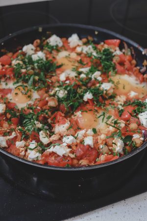 Bolognese, egal ob mit Fleisch oder vegan, schmeckt damit vorzüglich und erst recht Shakshuka. Bei dem israelischen Frühstücksgericht finde ich es schwer, Geschmack an den Sugo zu bekommen, wenn man so wie ich nicht gleich schon morgens eine Knoblauchfahne haben möchte. Aber mit dem Fairtailen Gewürz wird der Mix aus Tomaten, Paprika, Zwiebeln, Kichererbsen und Eier einfach nur lecker. Wenn dann noch der halb geschmolzene Feta und frische Kräuter aus dem Garten dazukommen, ist dieses Gericht wirklich perfekt.