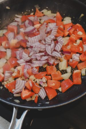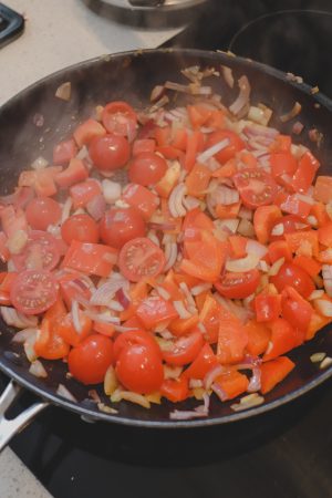 2 EL Rapsöl in einer beschichteten Pfanne erhitzen. Zwiebeln und Knoblauch mit mittlerer Hitze glasig dünsten, nach 2 Minuten die Paprika hinzufügen. Nach weiteren 2 Minuten kommen sowohl die frischen Tomaten als auch die Tomaten in der Dose mit in die Pfanne. Nach weiteren 2 Minuten die Kirchererbsen hinzugeben. 1 EL The Stew x Fairtailen Gewürz hinzugeben und alle Zutaten miteinander vermischen. Mit Salz abschmecken.