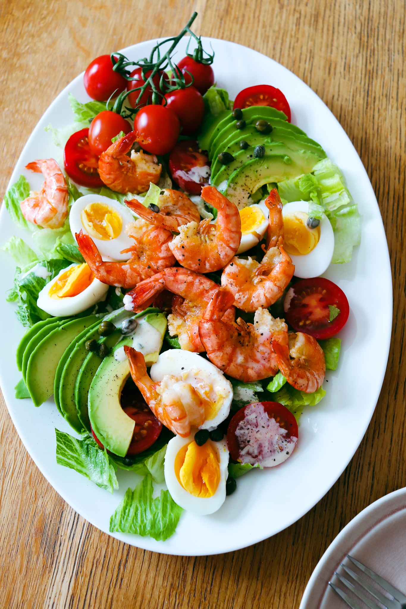 Den Salat auf einer großen Platte anrichten. Mit Eiern, Tomaten und Avocado garnieren. Ich empfinde es als modern, wenn nicht alle Zutaten gleichmäßig auf dem Salat verteilt sind, sondern kleine Inseln entstehen. Also hier mal ein paar mehr Tomaten hinlegen, da die Eier übereinander stapeln und einen Haufen der köstlichen Shrimps arrangieren.