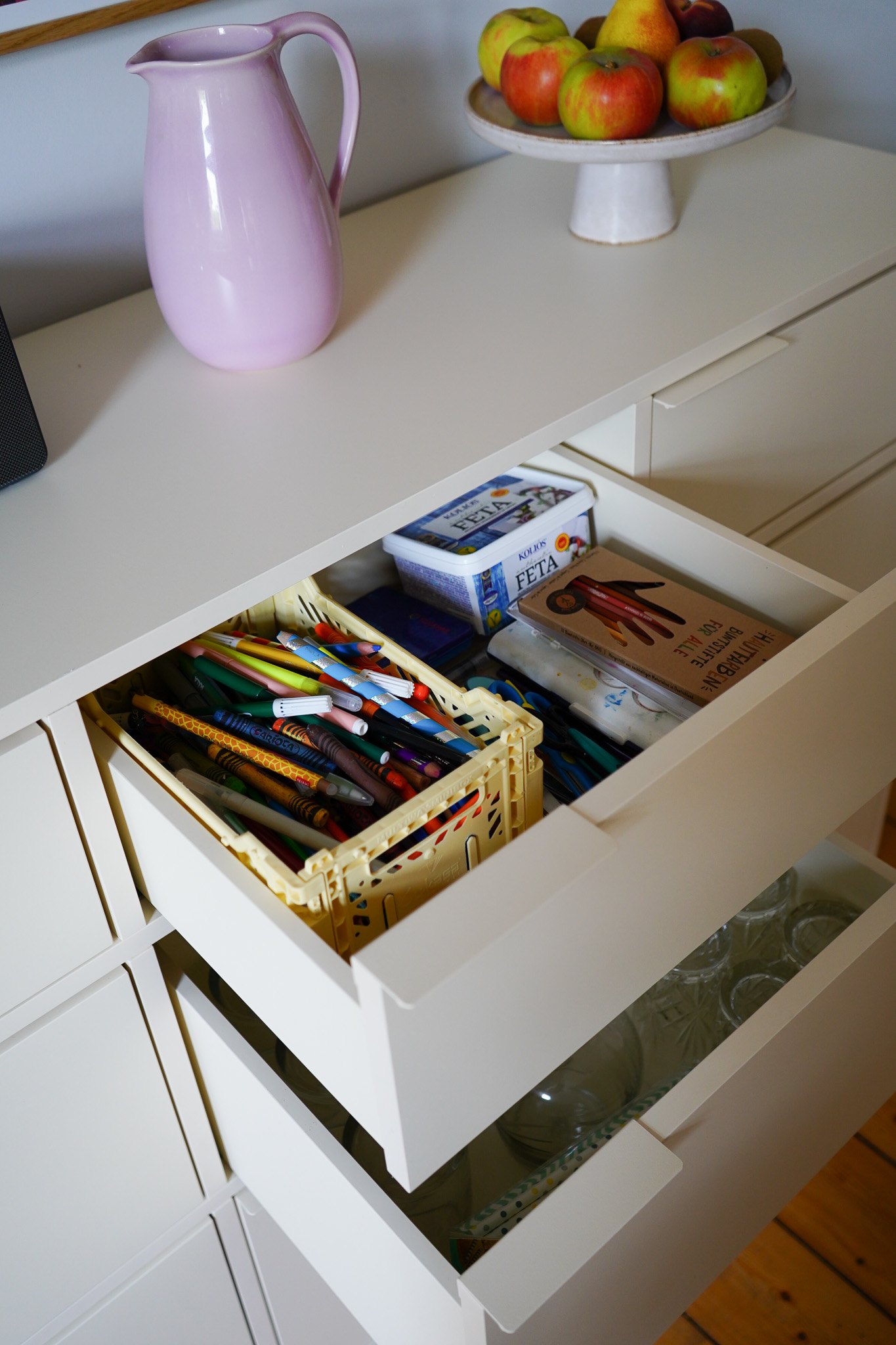 WERBUNG * | My sweet, sweet Home! Das neue Sideboard steht pünktlich zur Einschulung. Wir brauchten mehr Stauraum, vor allem für Schulzeug, weil die Kinder, wie ich gelernt habe, ihre Hausaufgaben vor allem am Esstisch erledigen. Wenn Flori und ich dann beide noch Homeoffice machen, kann keiner von uns arbeiten oder essen. Also habe ich dieses Stauraumwunder in Beige von Tylko bestellt. Ich habe das Modell 1:1 Herz und Blut nachgekauft, nachdem ich es bei Events im Atelier oft bewundert habe. Mit einem Code hat sich die Anschaffung echt gelohnt. Schaut mal, was alles hineinpasst: