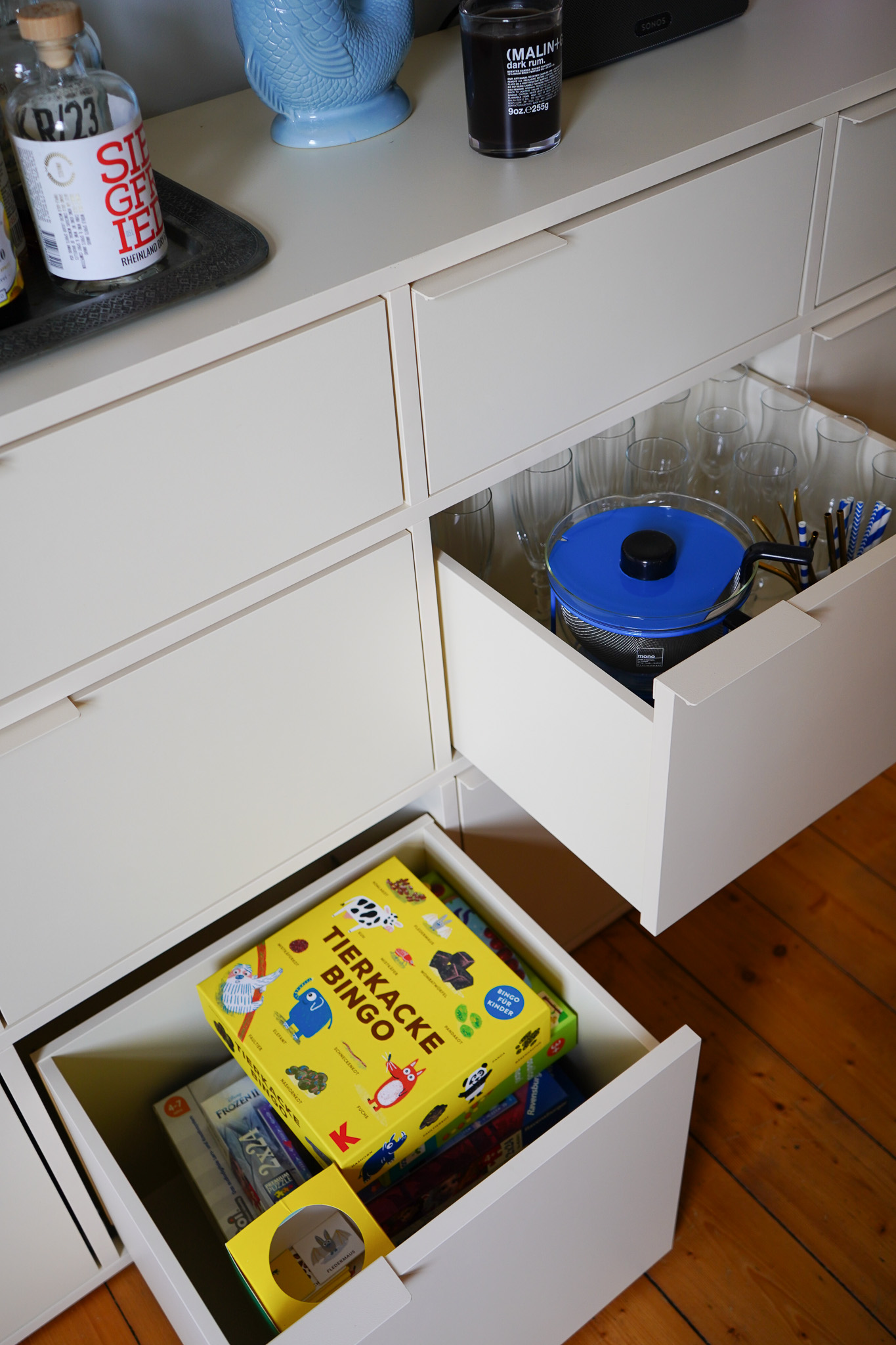 Als das Sideboard stand, fiel uns auf, dass wir fast alle Vorderseiten an die Rückseite gebaut haben. Hmpf! Floris Freund Olli hatte die gute Idee, einfach die Schienen für die Schubladen neu zu bohren, als das ganze Ding wieder auseinanderzuhämmern. Das hat super funktioniert und man sieht nichts. Sieht schön aus, oder was sagt ihr?