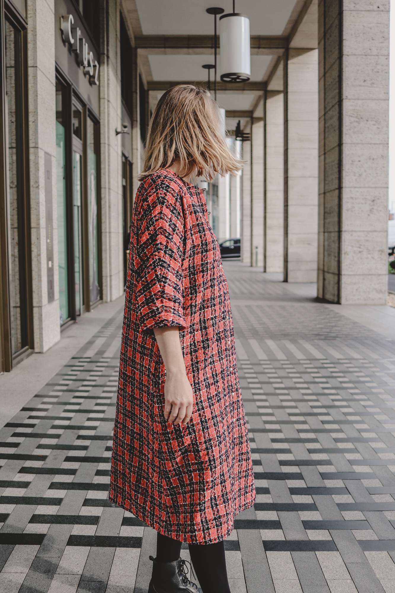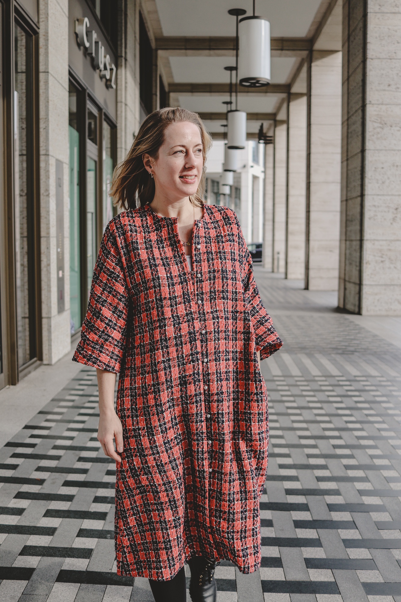 Ich fragte das Berliner Label Frisch (*Link), ob ich mir ein paar Kleider ausleihen dürfe. Das Kleine Schwarze mit Federn, eine aufregende Paillettennummer und ein rotes Tweedkleid. Alle Modelle waren super aufwendig gearbeitet und stimmten mich sofort in Partylaune. Aber das rote „The Christel“-Kleid, übrigens nach der stilsicheren Großmutter der beiden Designerinnen benannt, konnte noch ein bisschen mehr, als mich nur gut aussehen lassen, wie ich fand. Es sorgte für ein Wohlgefühl, das von Partykleidern eher nicht ausgeht, zumindest nicht von denen, die in meinem Schrank hängen. Sorgen wie „Das Kleid ist zu eng“, „Der Rock ist zu kurz“ oder „Bin ich darin zu aufgedonnert?“ hatte ich nicht.