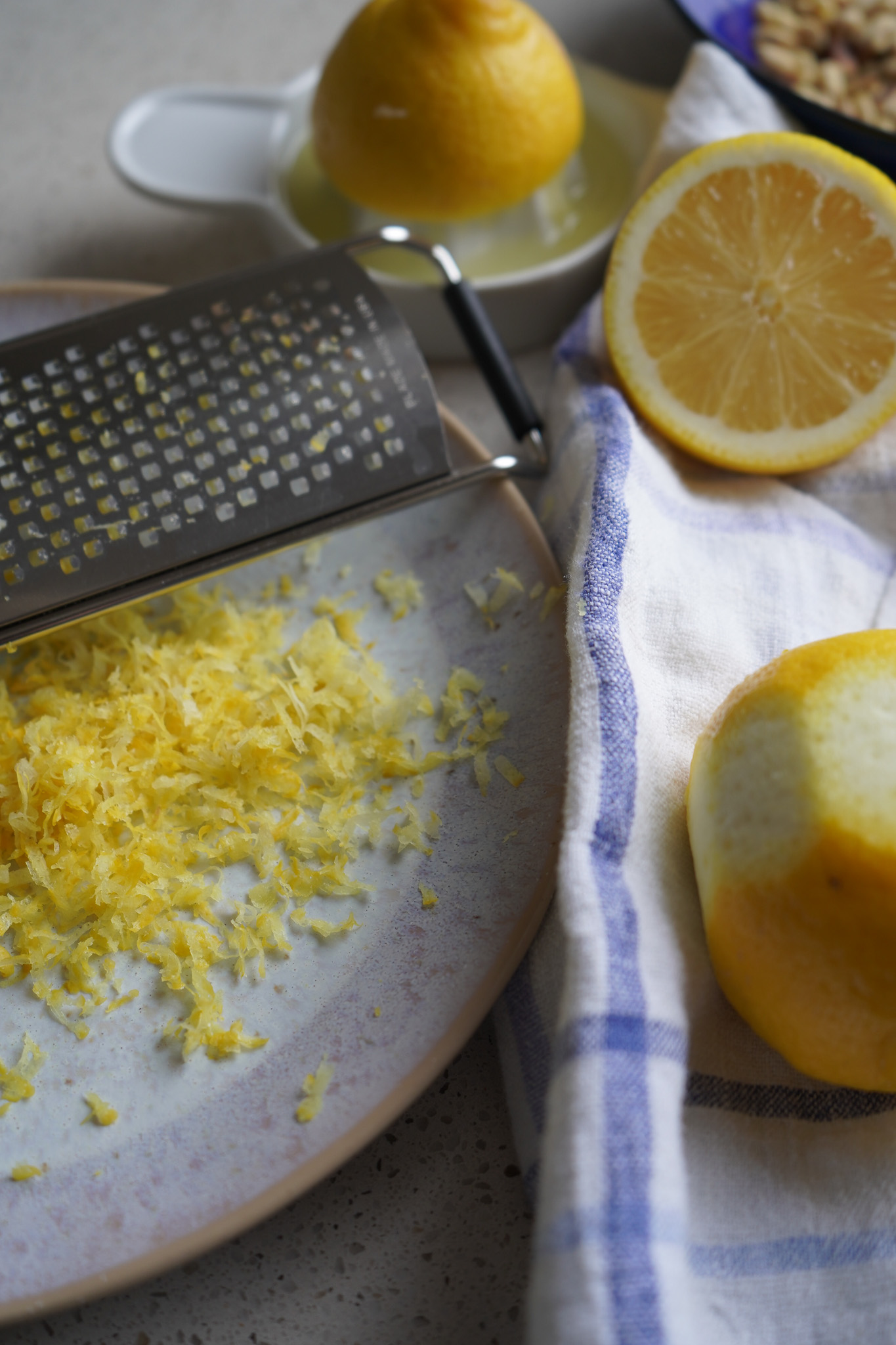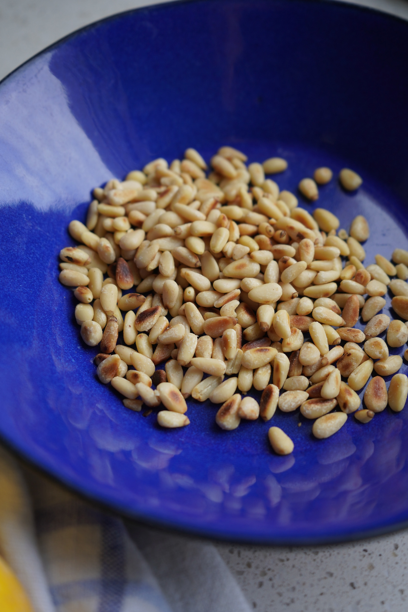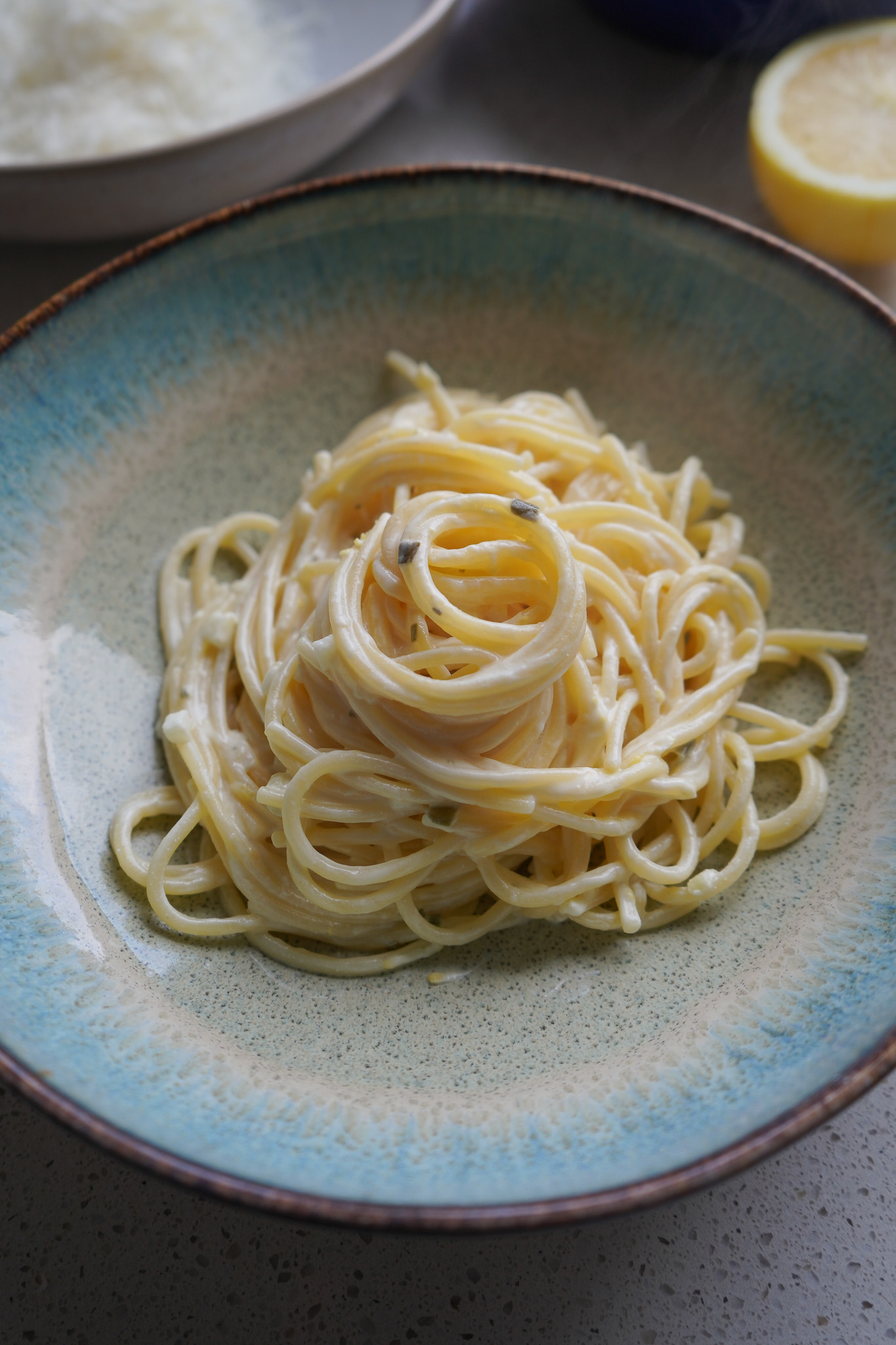 Nudeln abgießen und ebenfalls unterrühren. Mehr Salz? Bitte. Mehr Zitrone? Den Rest des Saftes hinzugeben. Mehr Pep? Pfeffer. Soße reicht nicht? Mit etwas Wasser verdünnen und verrühren. Fertige Nudeln auf eine Gabel drehen und auf den Teller setzen. Parmesan über die Pasta reiben. Pinienkerne darüber streuen. Mit der restlichen Zitronenschale garnieren. Wer mag, kann sich noch etwas Olivenöl darüber gießen. Guaden!