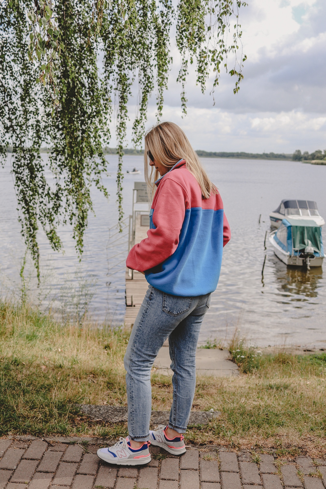 Meine Freundin Marlene hat festgestellt, dass sie mit dem Alter immer lieber Beige trägt. Sie „verbeigt“ also, wie man so schön sagt. Ich dagegen „verfleece“ hier auf dem Land. Für den Garten habe ich z.B. eine graue Fleecejacke zum Einsauen und dieser pinke Traum war Floris Geschenk zu meinem 41. Geburtstag. Dieses Neon-Outfit ist in der Eile reiner Zufall gewesen. Die Schuhe habe ich an einer Bloggerin gesehen, die aber so einen krassen Filter benutzt, dass Neonpink wie Pfirsich aussah. Ihr könnt euch mein Gesicht vorstellen, als ich die Farb-Kombi in den Händen hielt. Auf der anderen Seite sind die Schuhe total bequem. Komfort sticht Augentechno: Also habe ich sie behalten.