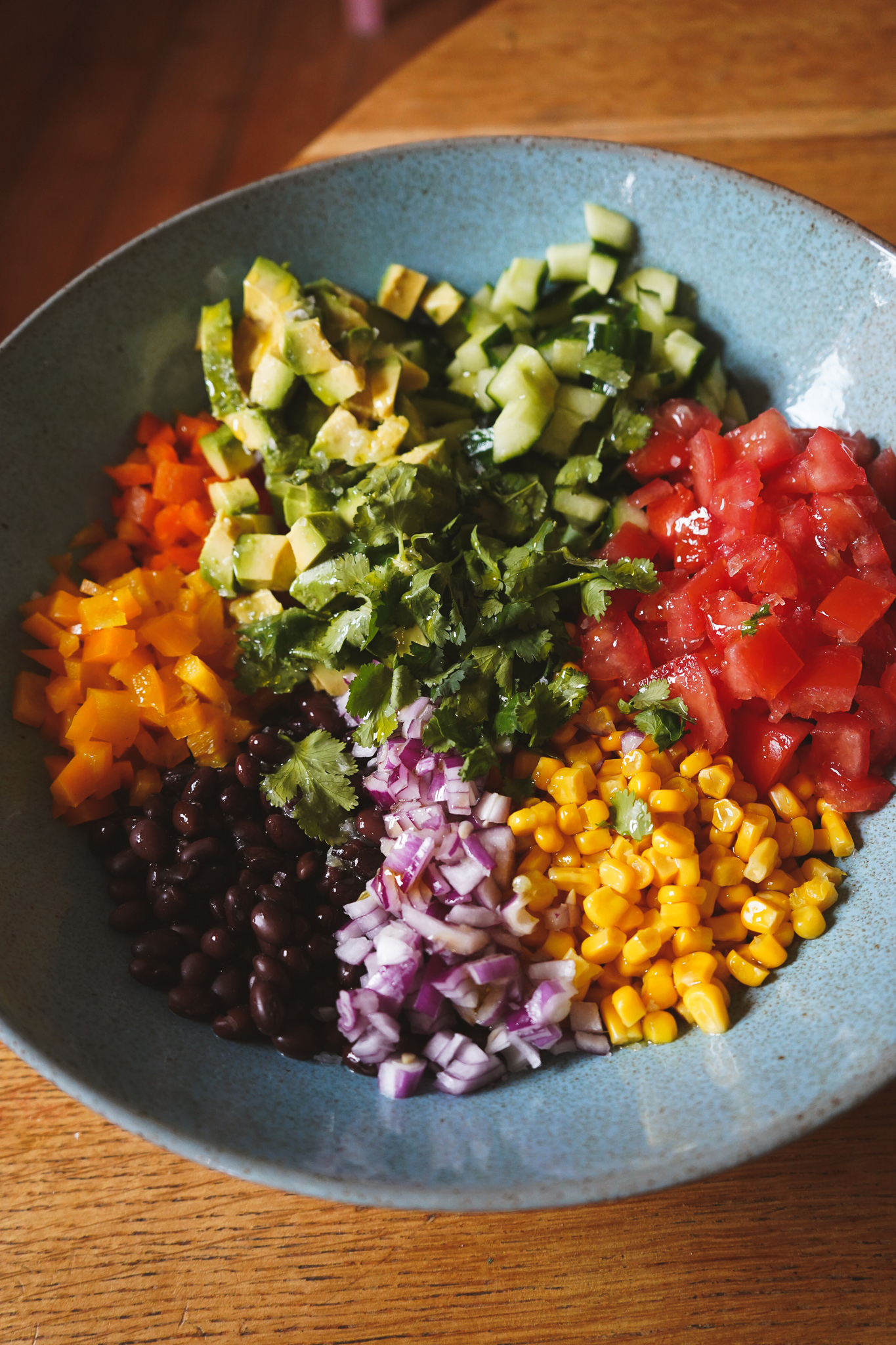 Das Wasser von Mais und Bohnen abgießen, das Gemüse abbrausen und gut abtropfen lassen. Tomate, Gurke und Paprika waschen. Tomate halbieren, entkernen und in kleine Würfel schneiden. Gurke halbieren, entkernen, vierteln und ebenfalls in kleine Würfel schneiden. Alle Zutaten nach und nach in eine große Schüssel geben. Zwiebeln schälen, halbieren und würfeln. Beide Sorten Paprika entkernen und würfeln. Avocados halbieren, entkernen, häuten und dann ebenfalls in Würfel schneiden. Vorsichtig zu den anderen Zutaten geben. Koriander von den Stängeln zupfen und dazu geben. Limetten auspressen. Den Saft in einer Schüssel mit Honig, Salz, Olivenöl und – wer mag – Chiliflocken vermengen. Das Dressing über den Salat geben und alles vorsichtig vermengen. Abschmecken und nach Geschmack nachwürzen.