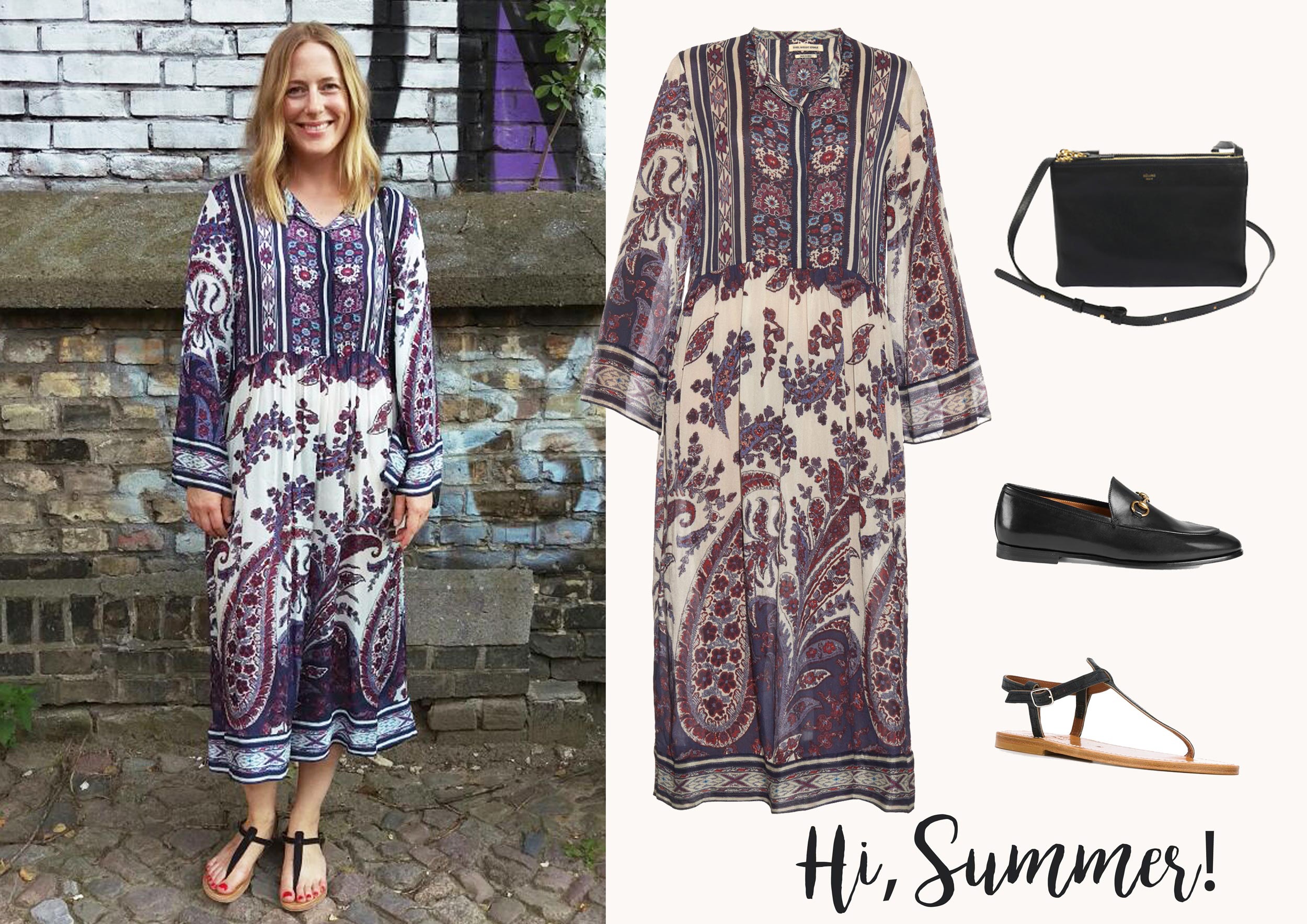 Als Kontrast zu dem Kleid passen schwarze oder neutrale Accessoires. Ich habe meine Céline Trio Bag wieder ausgegraben, die Sandalen trage ich schon den zweiten oder dritten Sommer. Die Gucci Loafer sind neu. Die Kombi Kleid + Loafer habe ich mir von irgendeinem Streetstyle-Star abgeschaut, leider weiß ich nicht mehr, wer es war. Eine Italienerin, glaube ich!