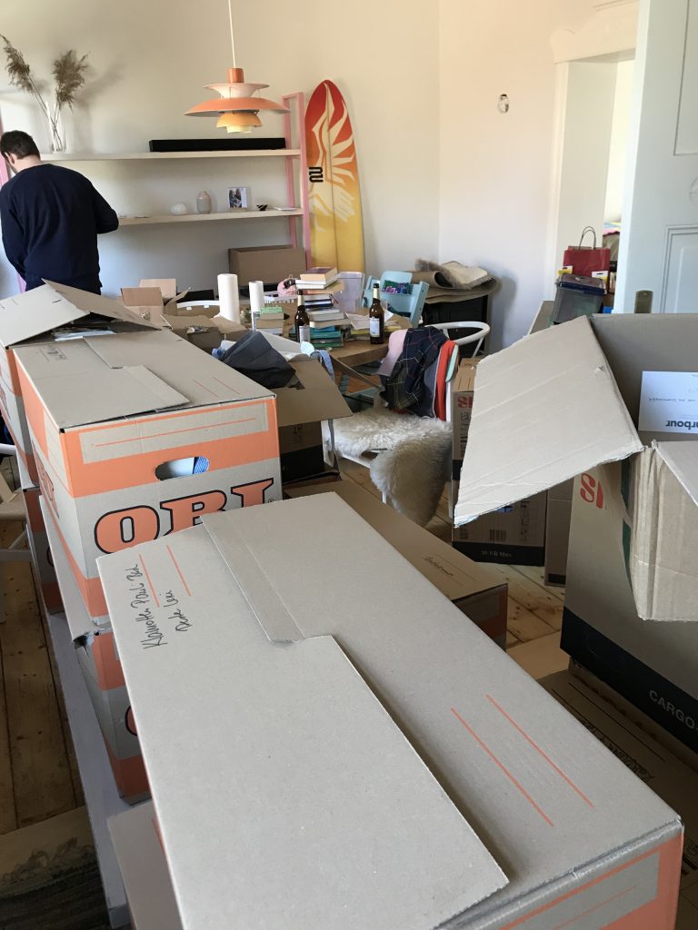 Wenn man also ein professionelles Umzugsunternehmen bucht kann man oft 14 Tage vorher kostenlos (!) Kartons bestellen, die nach Hause geliefert werden. Die Dinger aus dem Baumarkt oder der Metro sind teuer und halten nicht lange, wenn man sie mit schweren Büchern oder Geschirr befüllt. In diesem Zusammenhang möchte ich euch außerdem raten: Akzeptiert das Chaos vor, während und nach eines Umzuges. Wenn das gesamte Eigentum in Kartons lagert, zwischendrin das Baby auf der Klobürste kaut und keiner weiß, in welcher Kiste die Bettwäsche ist, dann muss man selbst als zwangsgestörte Mutti mit Putzfimmel (ich meine mich!) loslassen.