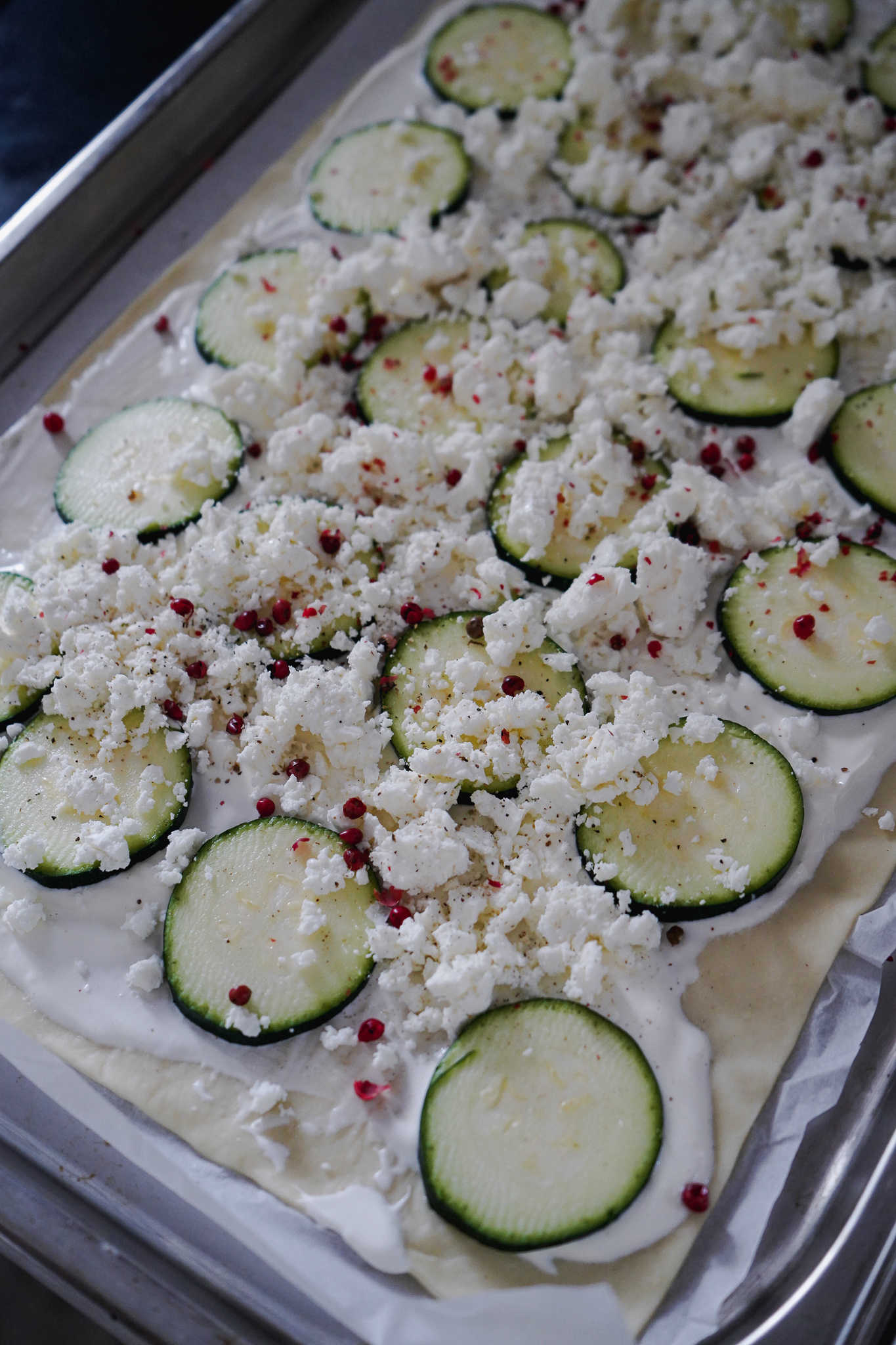 Flammkuchen-Fertigteig samt Backpapier auf einem Backblech ausbreiten. 1 Becher Crème fraîche mit einem Löffelrücken darauf ausstreichen. Mit dünnen Zucchinischeiben belegen. Salzen, pfeffern. 1 Feta darüber krümeln. Bei 180 Grad ca. 12-14 Minuten backen.