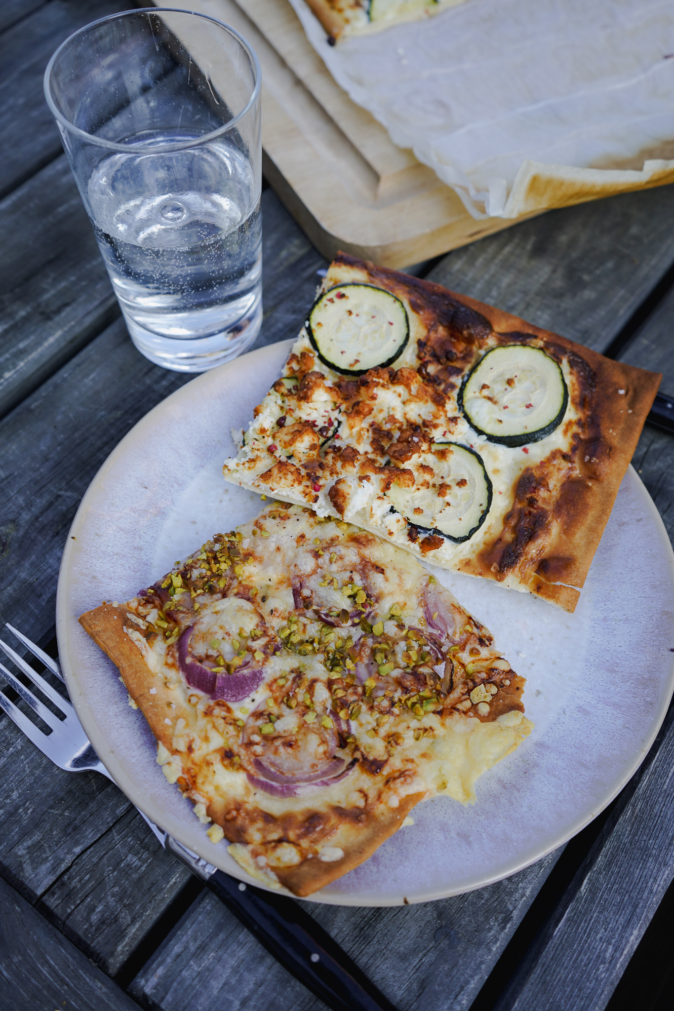 1. Flammkuchen mit roten Zwiebeln und Pistazien