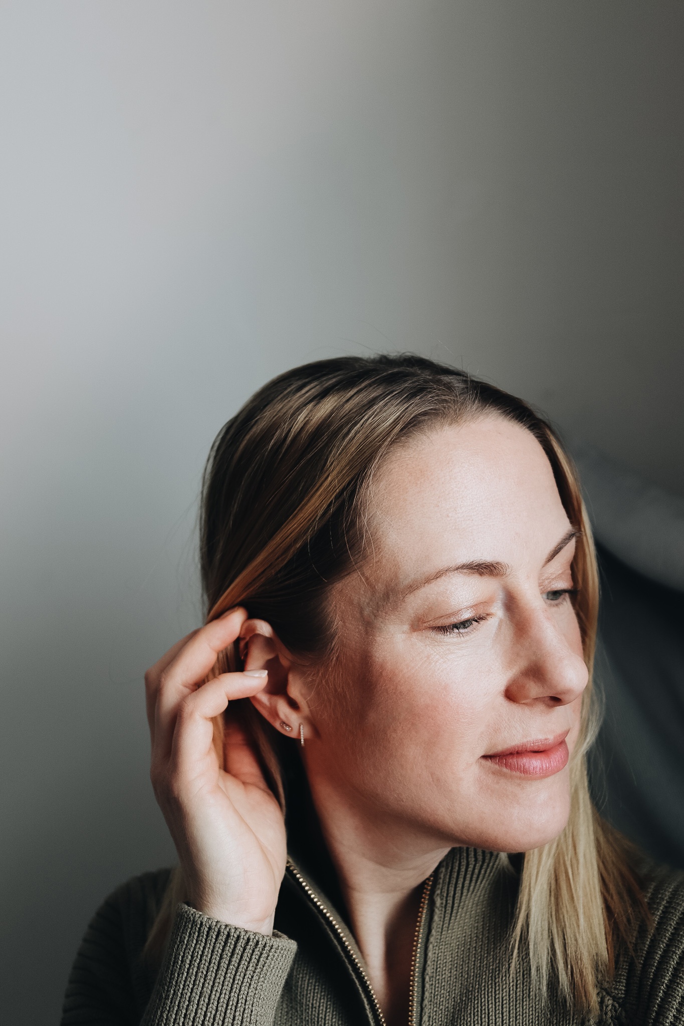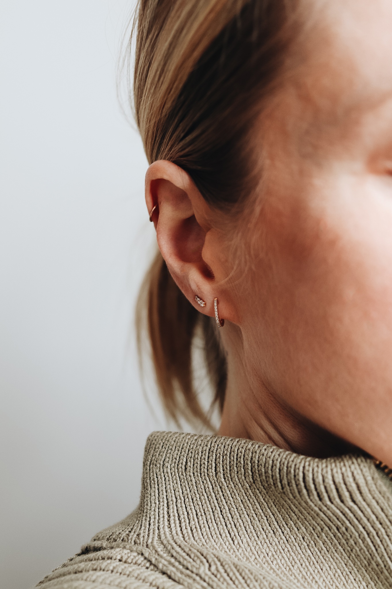 Ich trage – wie meistens tagsüber – meine kleinen Vieri Midi Hoops in Roségold mit kleinen Diamanten. Sie geben mir das gewisse Etwas an Selbstbewusstsein, weil sie meine Haltung verändern und mir ein gutes Gefühl geben. Wenn ich die trage, reicht mir oft nur ein kleines bisschen Lippenstift und ich fühle mich gewappnet für den Tag. Genau das ist es, was Schmuck mit einem machen kann.