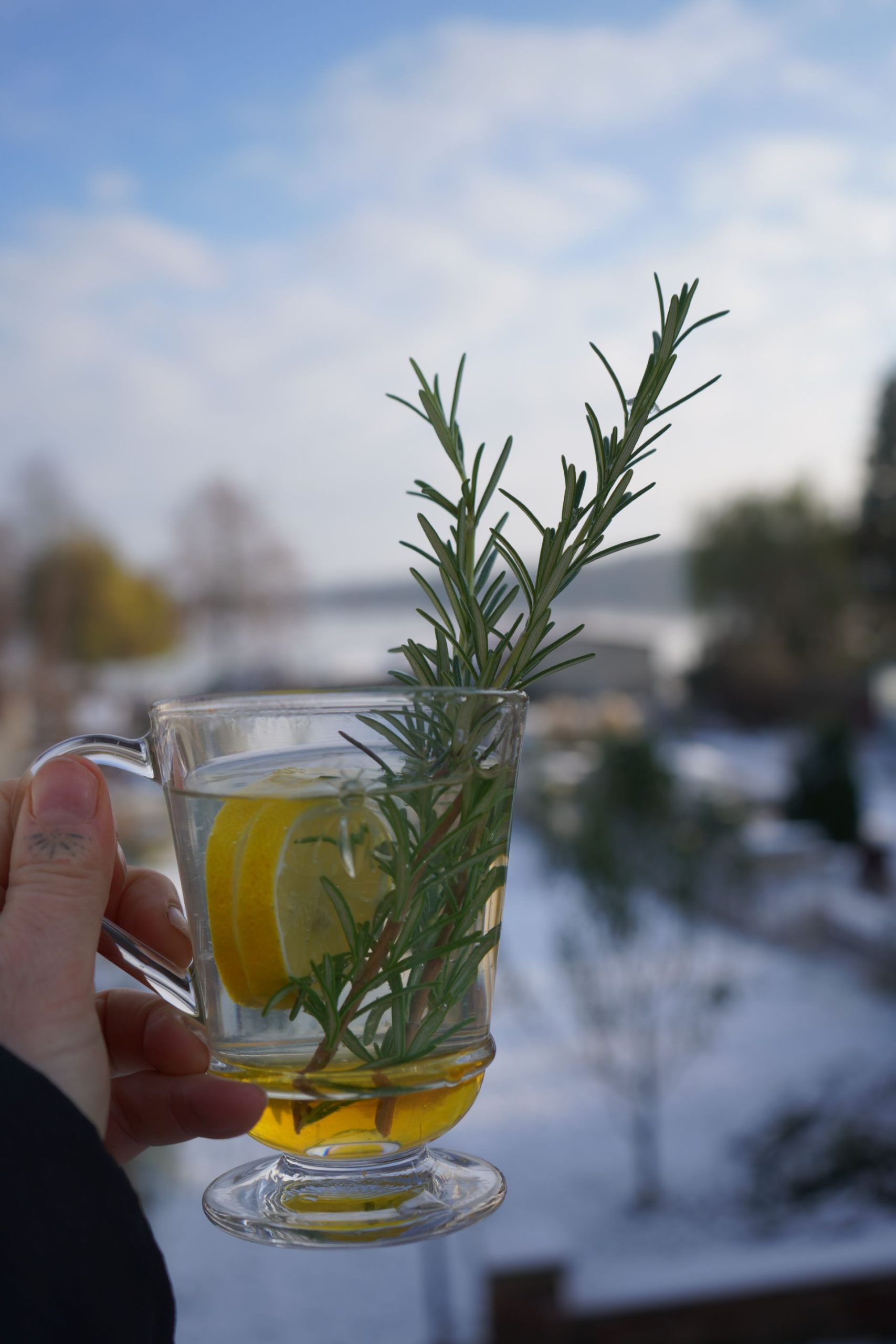 Wir sehnen alle den 22. Dezember herbei, weil es dann zu meiner Familie nach NRW und in die Weihnachtsferien geht. Damit keiner krank wird, trinken wir jede Menge heiße Rosi: Bei uns ist das Rosmarin aus dem Garten, mit Zitrone und Honig vom Nachbarn, der gefühlt jede seiner Bienen persönlich kennt.