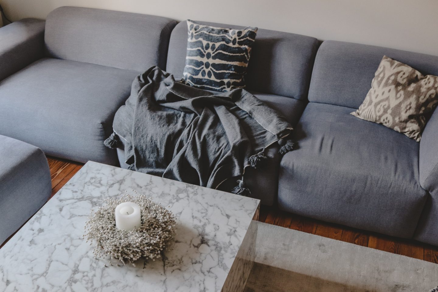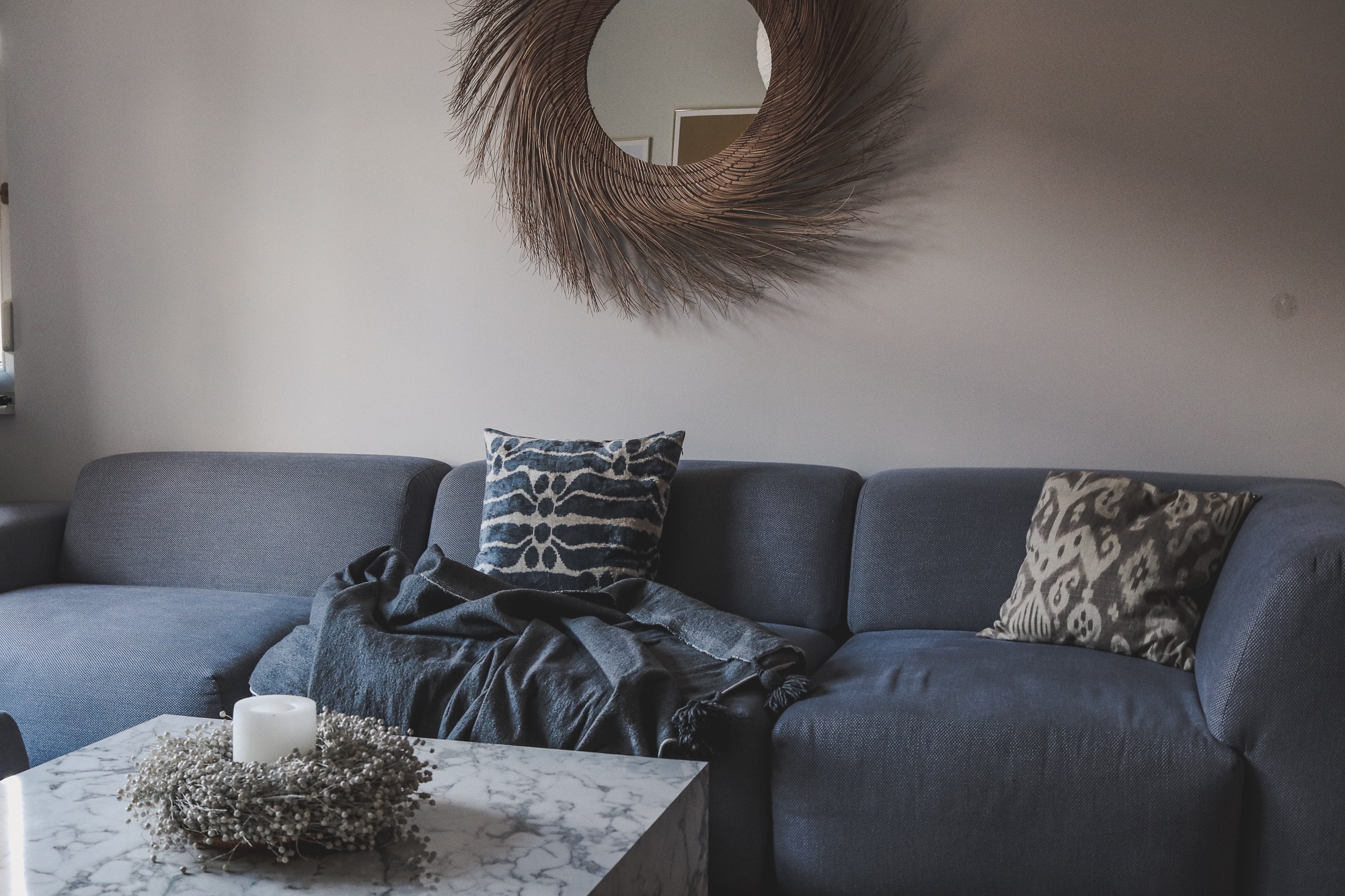 Runder Spiegel aus Kokosnussfasern: „Cebu“ von Maisons du Monde, Couchtisch: „Lesley“ von Westwing Collection , Sofa: Pyllow von Mycs, Kissen: Les Ottomans, Hello Petesen, Decke: Nandi, Flachskranz: Blumigo, Rustic Kerze: Depot, Teppiche: home24, The Weavery