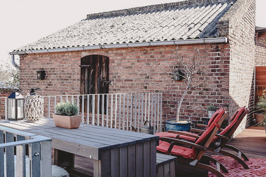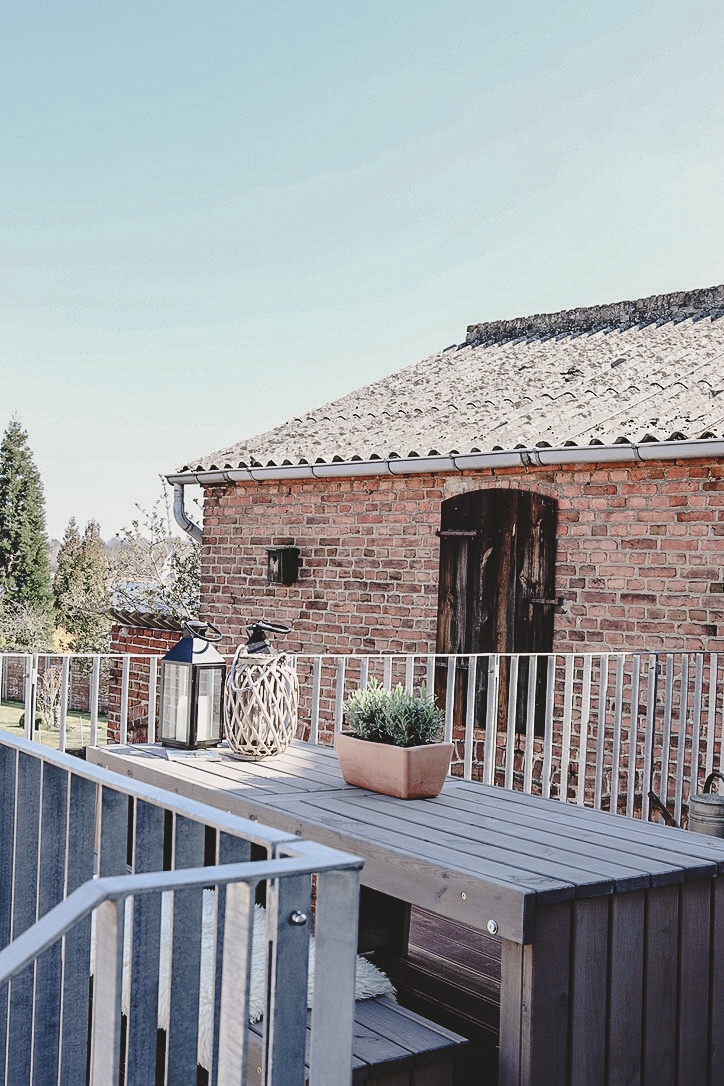 Die Terrasse ist unser Wohnzimmer für den Sommer. Und genau so haben wir sie auch eingerichtet. Mit Esstisch, Liegen und einer Sonneninsel, die schon zwei Sommer alt ist. Der Vintage-Teppich ist kein Outdoor-Teppich und wirkt deshalb so besonders. Wenn es das Wetter erlaubt, nehmen wir alle unsere Mahlzeiten al fresco, also unter freiem Himmel, ein. Bank und Tisch waren ein Schnäppchen und sind super für uns als Familie mit Kind, da keine Stühle umkippen können.