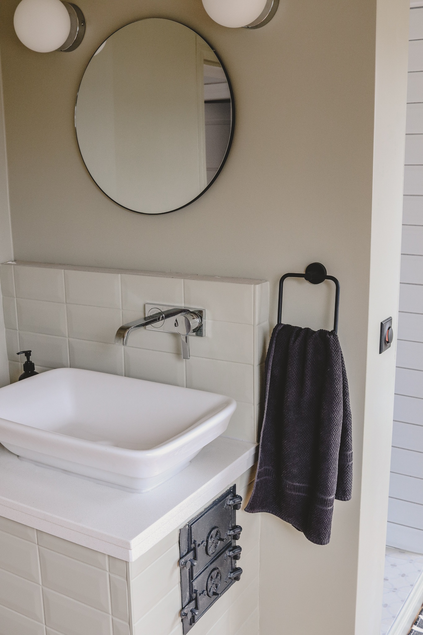Nach dem Krieg hat in diesem Raum eine ganze Familie gelebt – deshalb wollten wir z.B. das schmiedeeiserne Detail am Waschtisch in Szene setzen, denn es erinnert an die Zeiten, in denen hier gekocht, gewaschen und geschlafen wurde. Ich bin leider überhaupt kein Fan von rein dekorativer Nostalgie, aber da es unser gemeinsames Haus ist, mussten wir als Paar einen Kompromiss finden. Also bekam Flori sein Detail am Waschtisch und ich dafür meine Wunschfarbe an den Wänden.