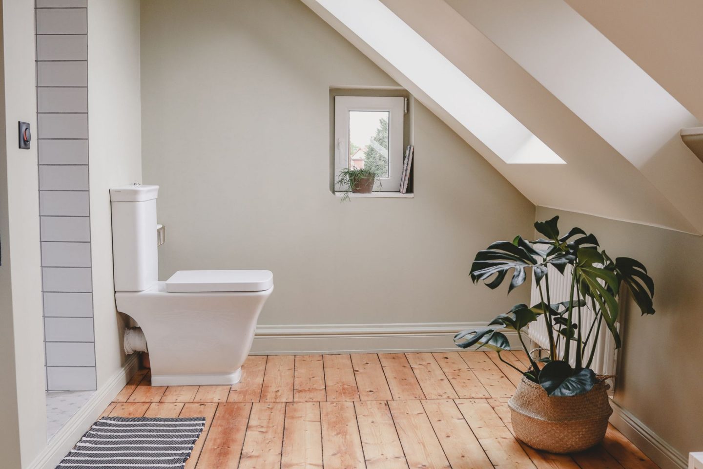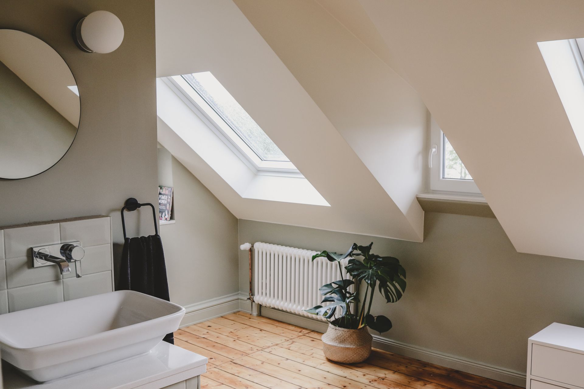 Wandfarben: Farrow & Ball, Dachschrägenfenster: Velux, schwarze Steckdosen und Lichtschalter: Busch-Jaeger, Handtuchhalter: Toom Baumarkt, Handtuch: Ikea, Armaturen: Grohe, Fliesen: Metrofliesen und Macaya Humo von Vives, Waschbecken und Toilette: Globo, Steinplatte: Maßanfertigung, weißer Schrank: MYCS, Messinghaken: House Doctor, Türklinken: Klinkenfabrik, Badezimmermatte und Korb: H&M Home, Dielen: Originaldielen von 1910, abgeschliffen und mit Hartöl geölt