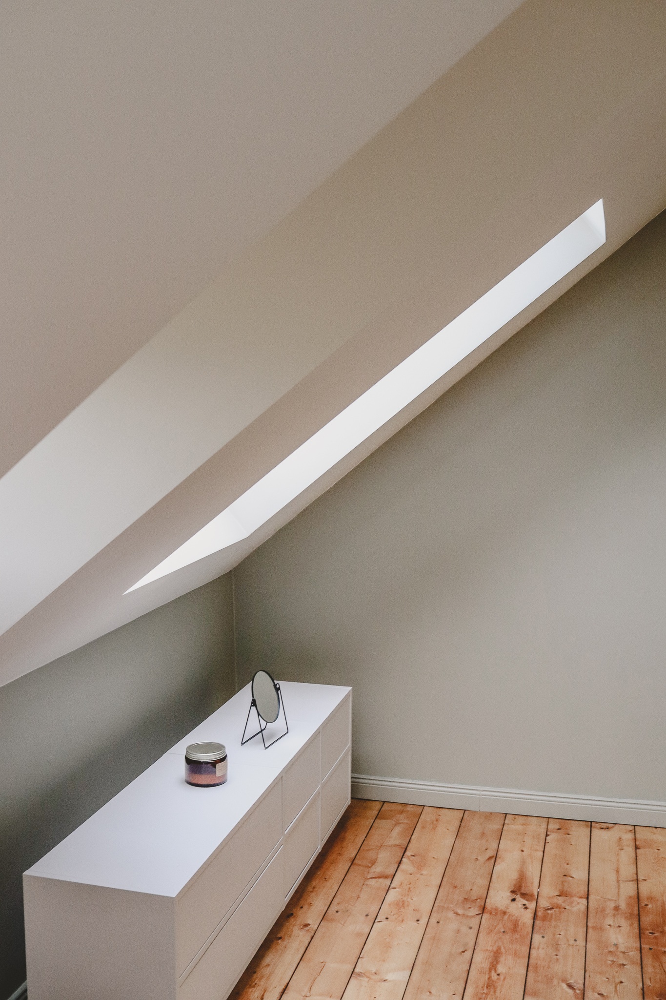 Für die Decken haben wir den Ton „Snow White“ verwendet, der eine softe Alternative zu einem klassischen Reinweiß darstellt. Die Farbe wirkt dank den gelben Pigmenten, die der Farbe beigemischt sind, warm und entspannt und harmoniert mit Holzboden, der über 100 Jahre alt ist. Wir fanden die Dielen so schön, dass wir uns gegen einen Fliesenboden entschieden haben.