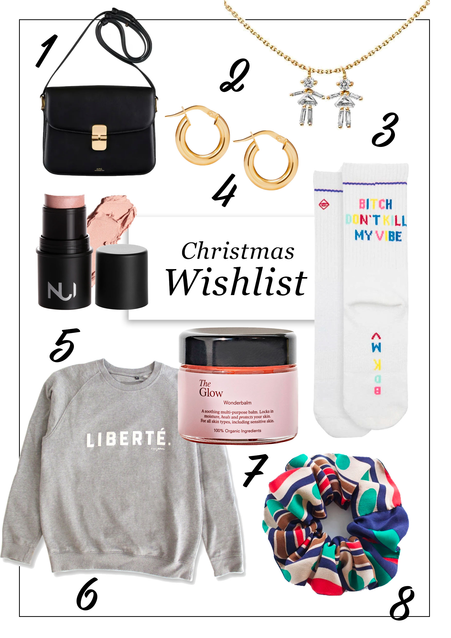 „Grace“ Bag Small von APC, Geschwister-Kette von April First, „Bitch don’t kill my vibe“-Socken von J Clay, Mini Hoops von Yes My Love, Cream Blush in „Mawhero“ von Nui Cosmetics, Liberté Sweater von Hello Petersen, Wonderbalm von The Glow, Scrunchie aus einem Vintage YSL-Tuch von James Accessoires, Pullover: Loulou Studio (auch hier)