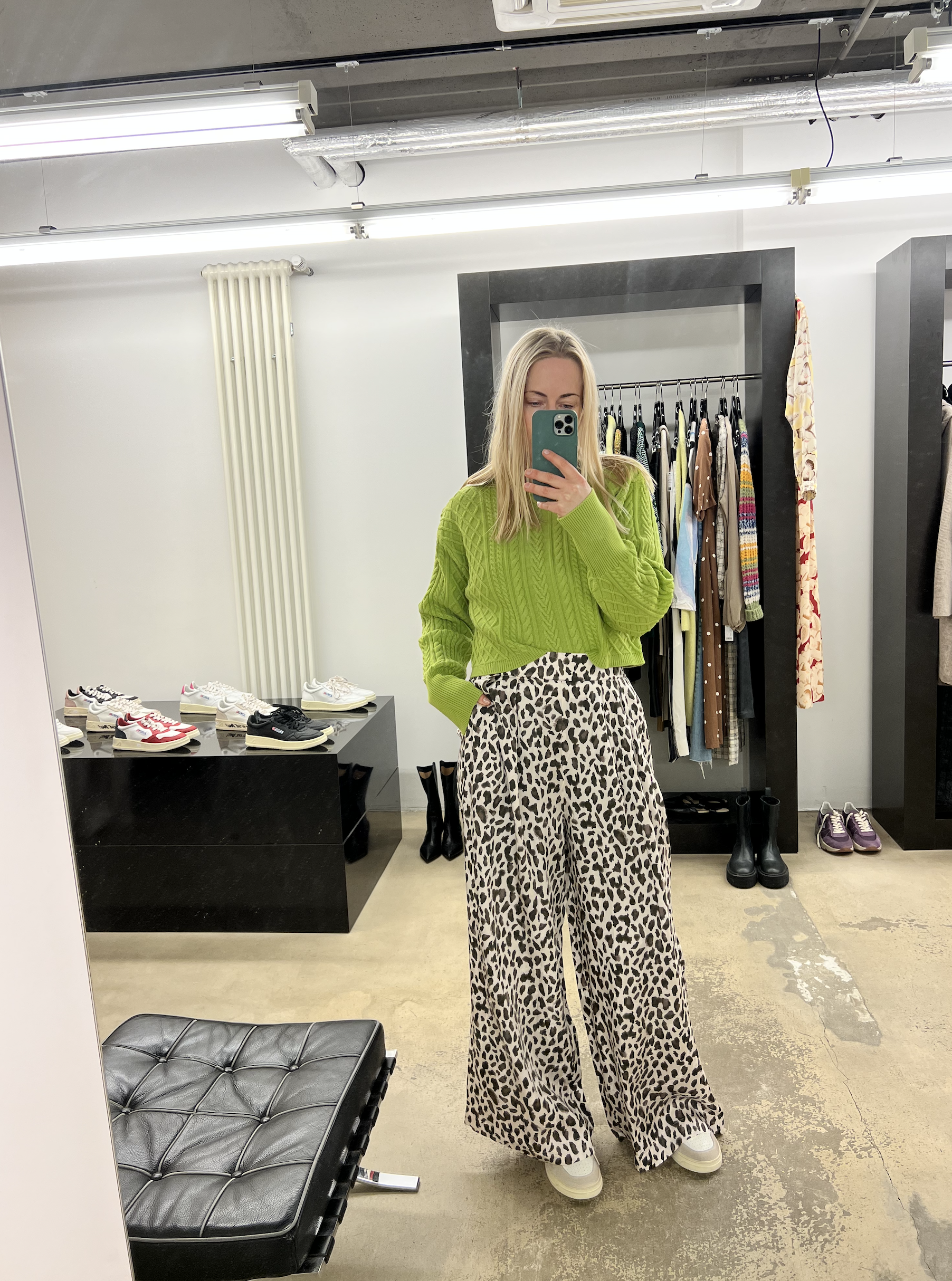 Wie diese! So bunt bin ich selten, aber das Grün macht Bock, denn der Frühling liegt in der Luft. Meine Freundin hat die beiden Teile danach sofort ins Schaufenster gepackt – mal sehen, wer von euch die Sachen nachkauft, am besten bei Orlando Berlin. Den limettengrünen Pullover trage ich in M, die Marlenehose mit Leomuster und Gummibund in 40. Gestern habe ich mir außerdem bei Maria Black in Mitte mein 8. Piercing stechen lassen – ein pinker Saphir. Damit trage ich meine Altersvorsorge offiziell am Ohr.