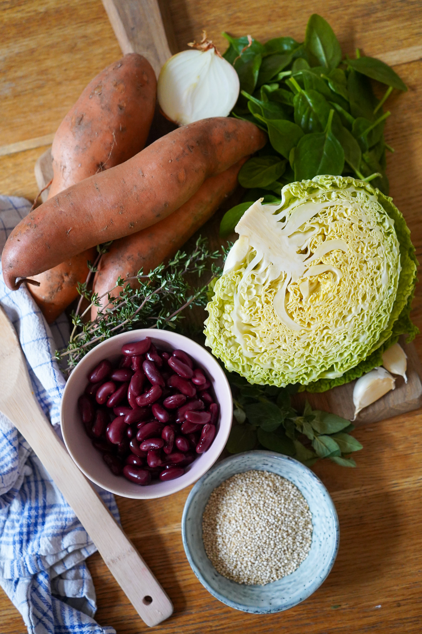 Während meiner Scheinfasten-Woche habe ich Suppen für mich wiederentdeckt und starte deshalb mit dieser Minestrone zusammen mit euch ins neue Jahr. Sie ist saisonal, vitaminreich und macht richtig schön statt. Im Original-Rezept steht statt Süßkartoffel eigentlich Kürbis. Den gab es bei uns aber nicht, ebenso wie Mangold, den ich durch Wirsing ersetzt habe. Hirse mag ich nicht (ich denke da immer an meinen Wellensittich Ida, der Hirsekolben gefuttert hat) und habe sie stattdessen durch Quinoa ersetzt. Ihr könnt aber auch Reis oder Nudeln vorkochen und diese dann zur Suppe geben.
