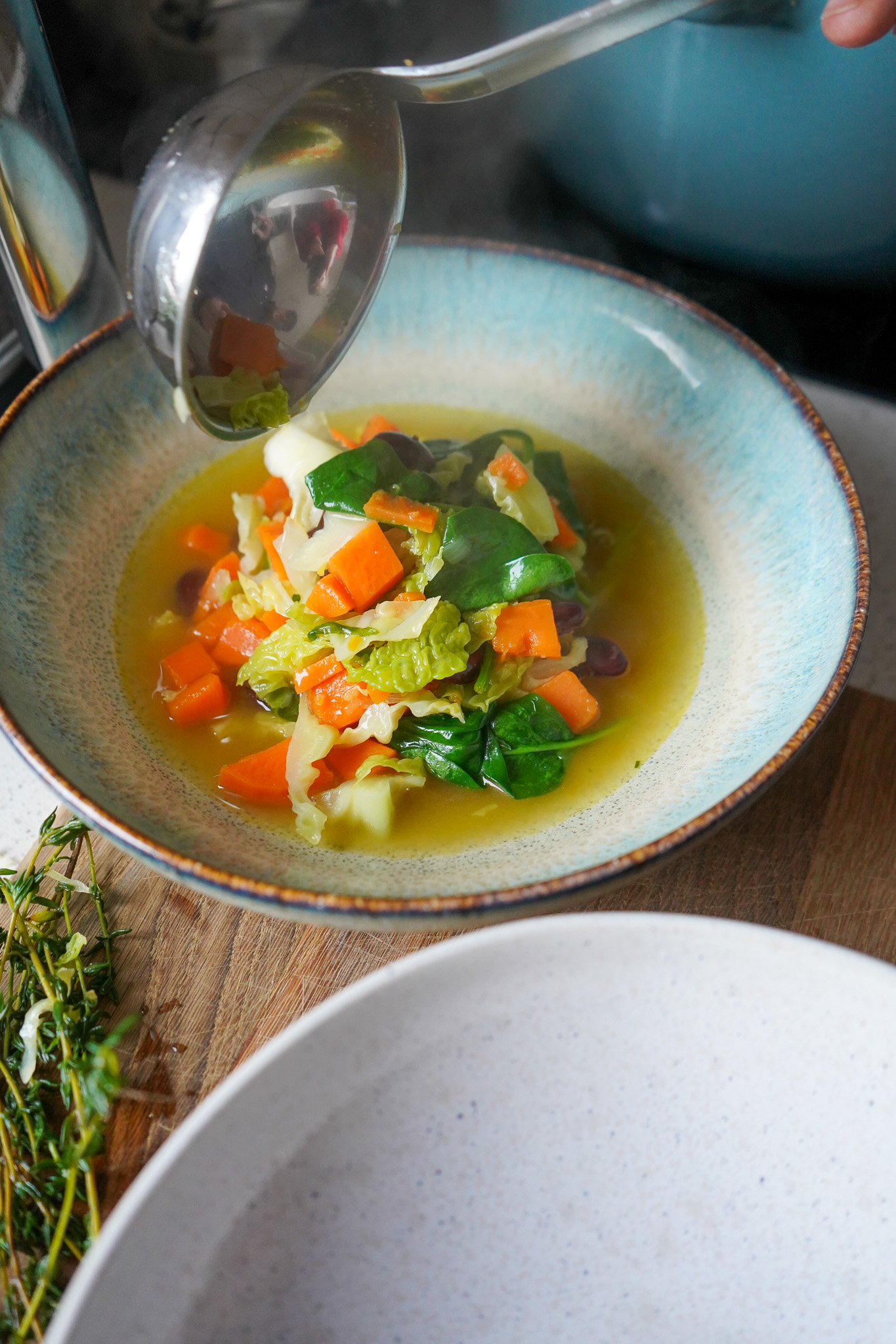 Während meiner Scheinfasten-Woche habe ich Suppen für mich wiederentdeckt und starte deshalb mit dieser Minestrone zusammen mit euch ins neue Jahr. Sie ist saisonal, vitaminreich und macht richtig schön statt. Im Original-Rezept steht statt Süßkartoffel eigentlich Kürbis. Den gab es bei uns aber nicht, ebenso wie Mangold, den ich durch Wirsing ersetzt habe. Hirse mag ich nicht (ich denke da immer an meinen Wellensittich Ida, der Hirsekolben gefuttert hat) und habe sie stattdessen durch Quinoa ersetzt. Ihr könnt aber auch Reis oder Nudeln vorkochen und diese dann zur Suppe geben.