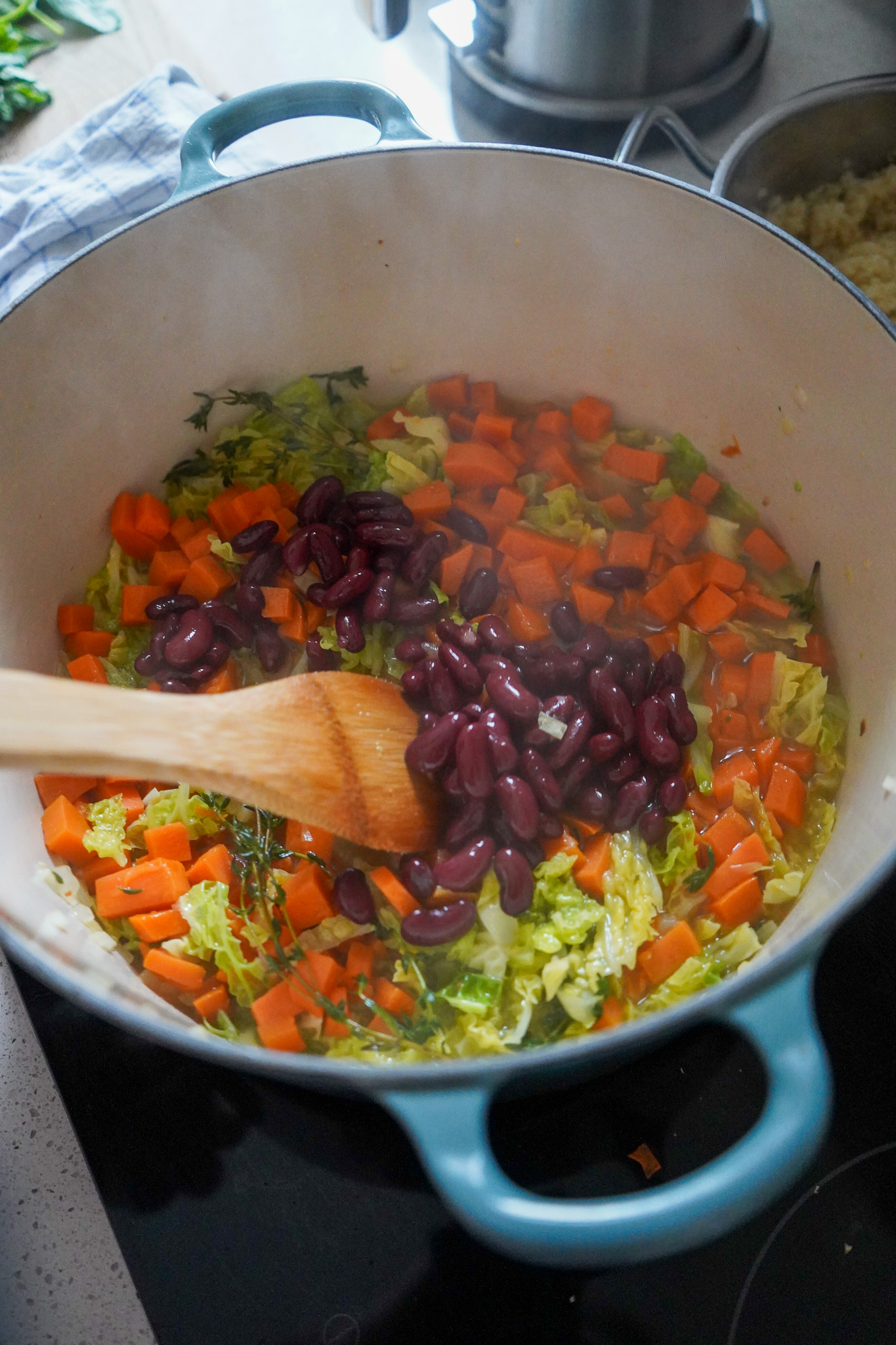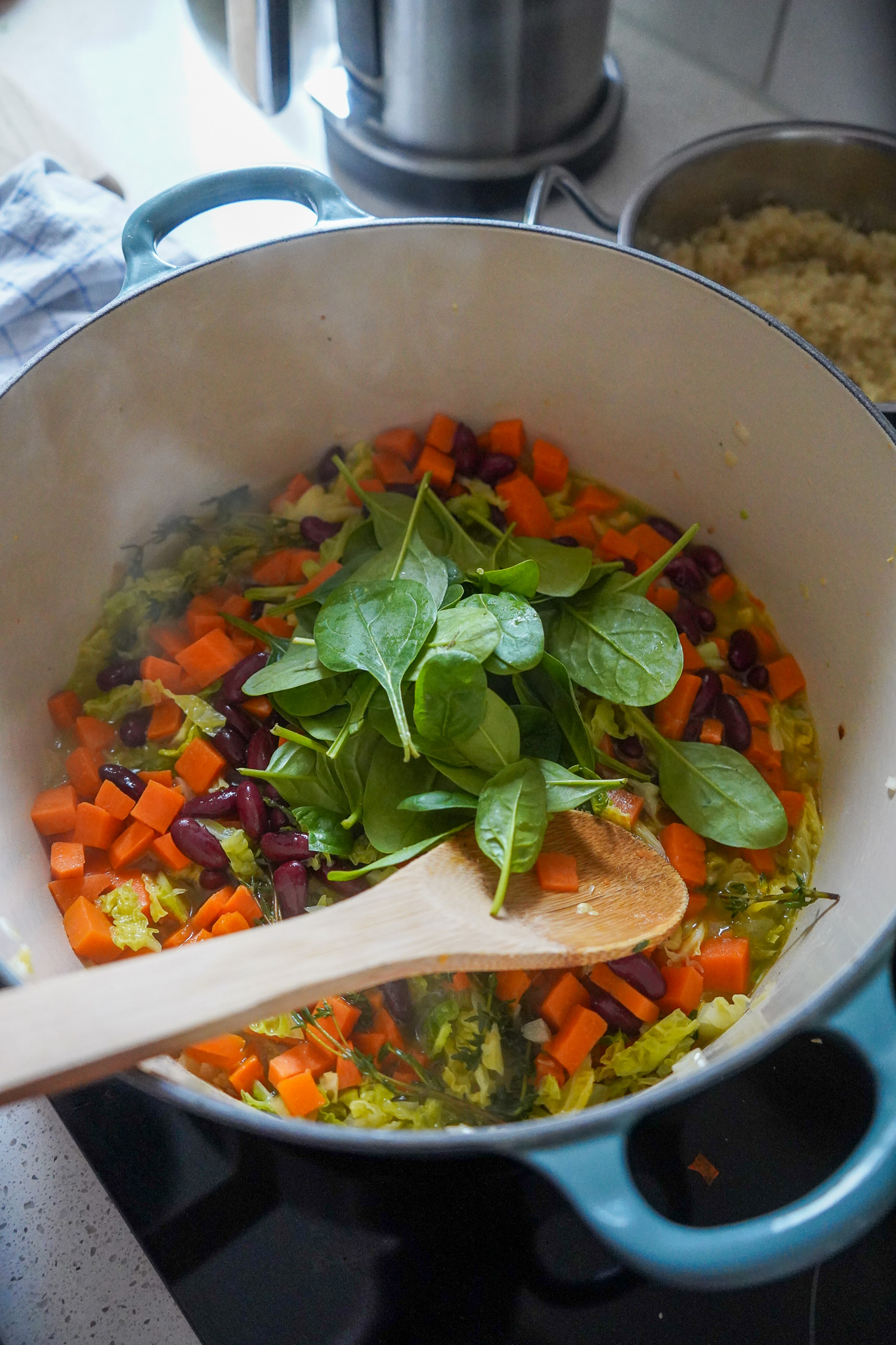 Kurz vor dem Servieren die Süßkartoffeln, Kidneybohnen und Spinat hinzufügen. Vorsichtig untermengen, mit einem Spritzer Zitronensaft (oder hellem Essig) abschmecken und mit ein paar Löffeln Quinoa, Nudeln oder Reis servieren. Wer mag, würzt die Suppe mit Hefe- und/oder Chiliflocken. Guten Hunger!