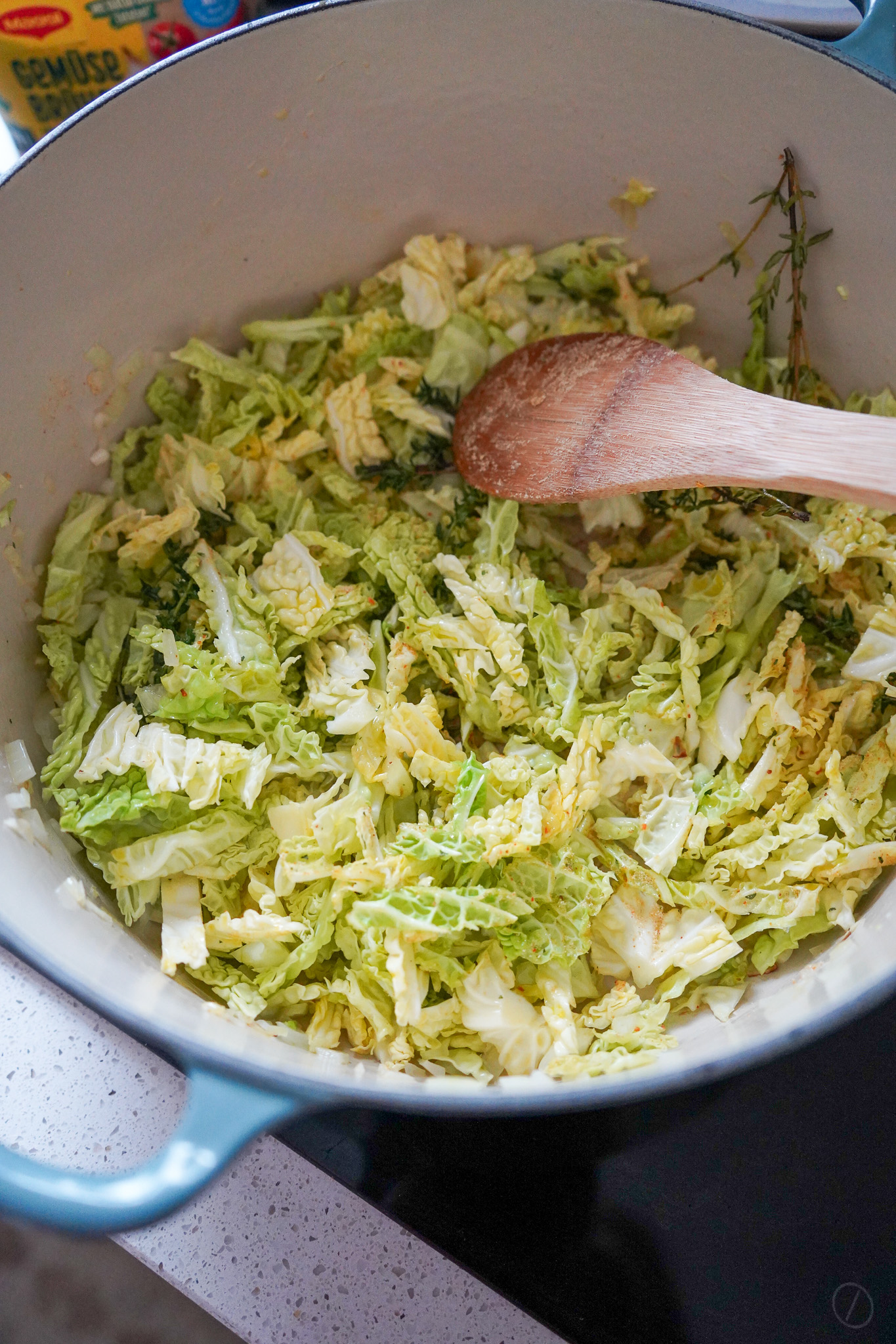 Zwiebel und Knoblauch schälen. Beim Knoblauch den bitteren Keim entfernen. Alles klein schneiden und mit 2 EL Öl in einem großen Topf ebenfalls anbraten. Wirsing und Thymian hinzufügen. Kurz alles zusammen anbraten (aber nicht zu doll bräunen lassen!), Gemüsebrühe hinzufügen und mit 2 Tassen Wasser ablöschen. So lange köcheln, bis der Wirsing gar ist.