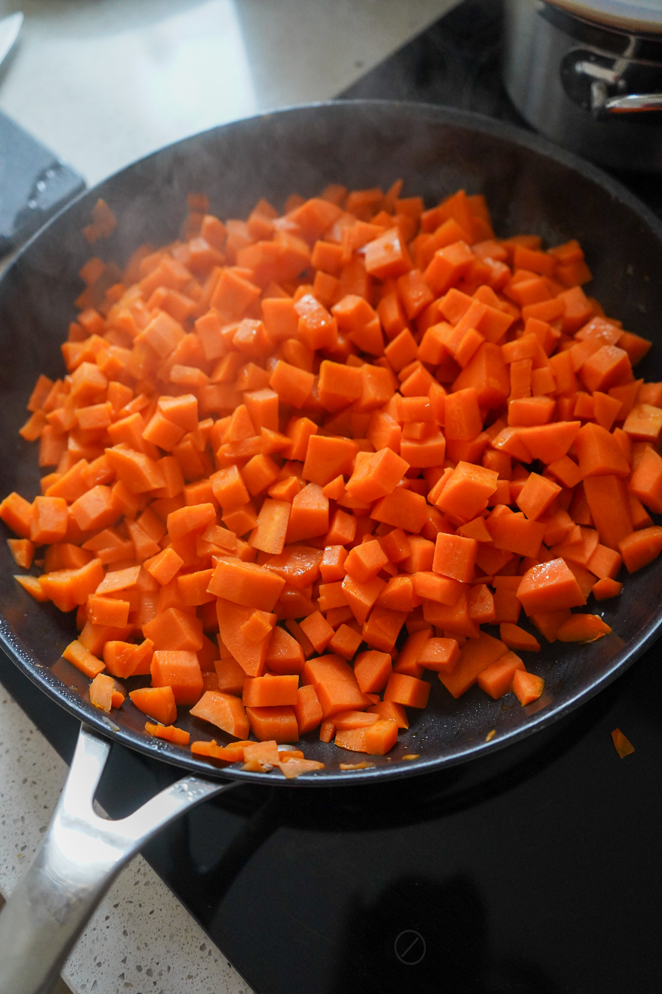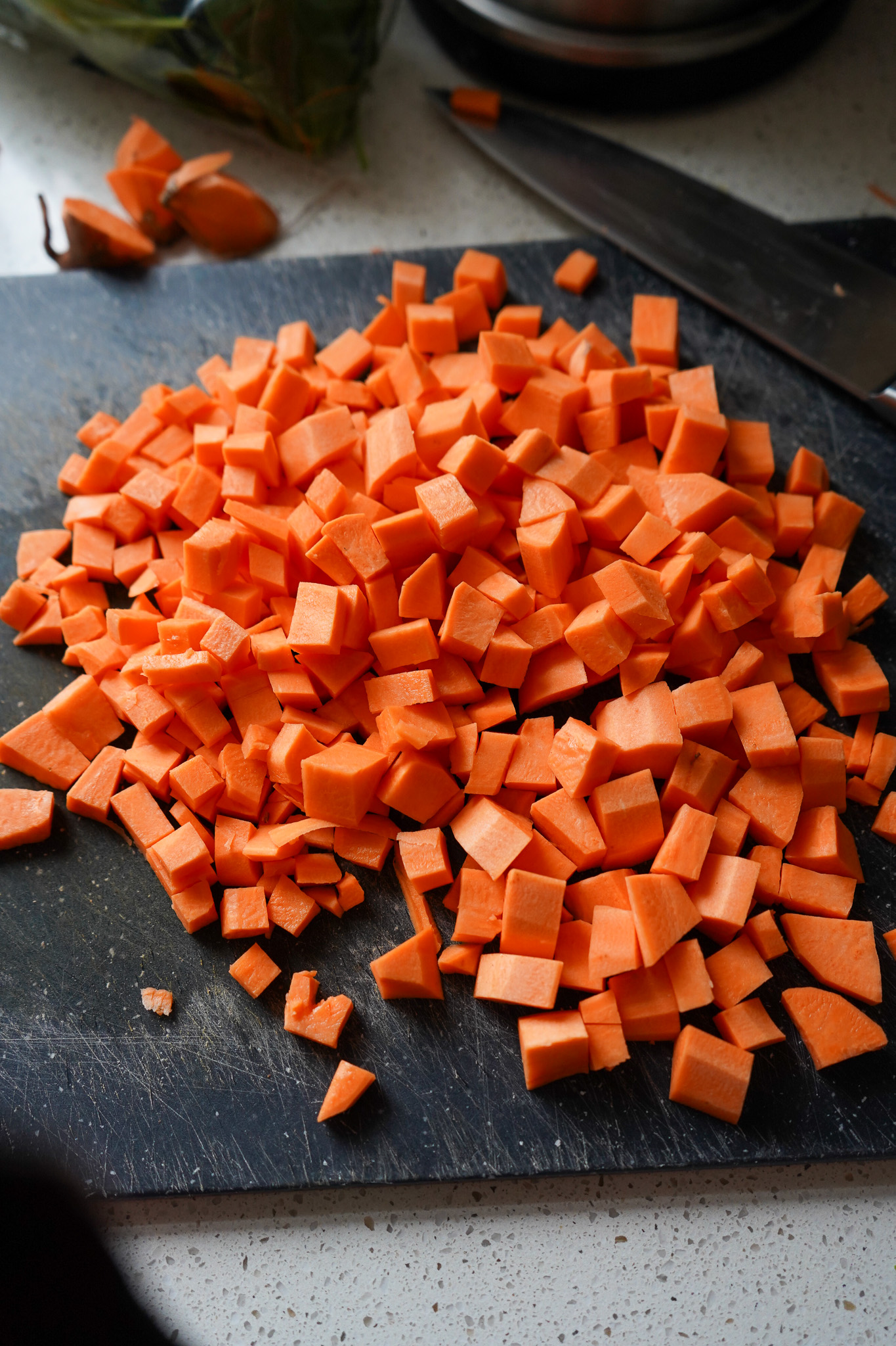 Zwei Hacks verrate ich euch, wie ihr Süßkartoffeln einfacher zubereiten könnt und wie Bohnen weniger Blähungen verursachen. Süßkartoffeln vor dem Kochen schälen ist ein guter Tipp, weil die Dinger nach dem Kochen lange irre heiß sind und weich werden, sodass das Schälen schwierig ist. Deshalb schäle ich sie für die Suppe vorher, schneide sie in kleine Würfel und brate sie parallel in einer Pfanne an. Ansonsten würden sie in der Suppe zerfallen.