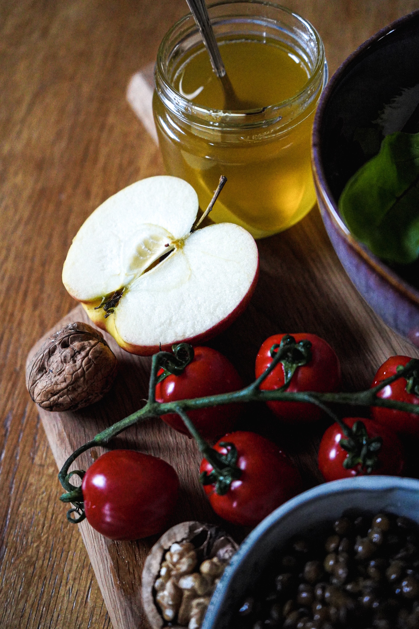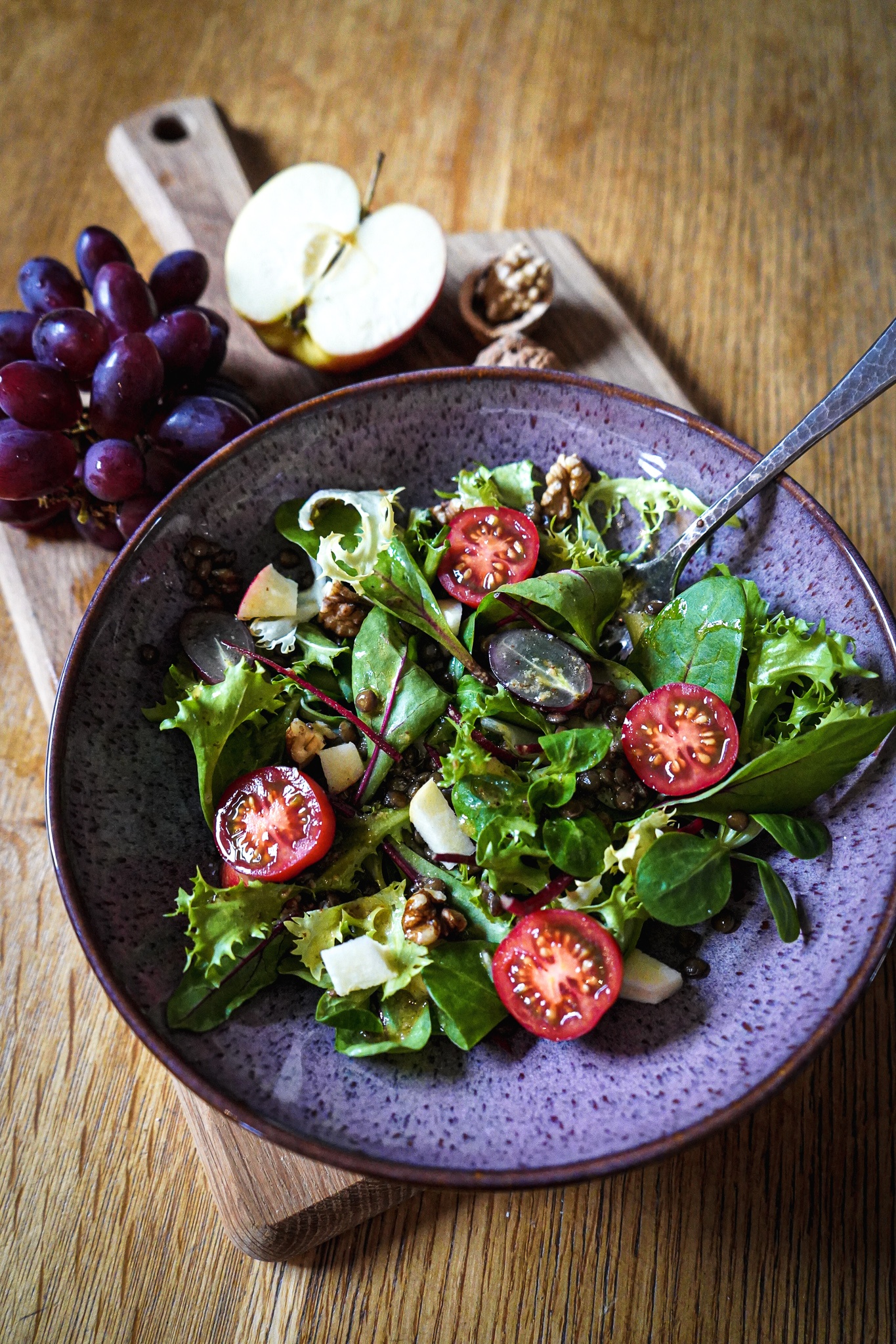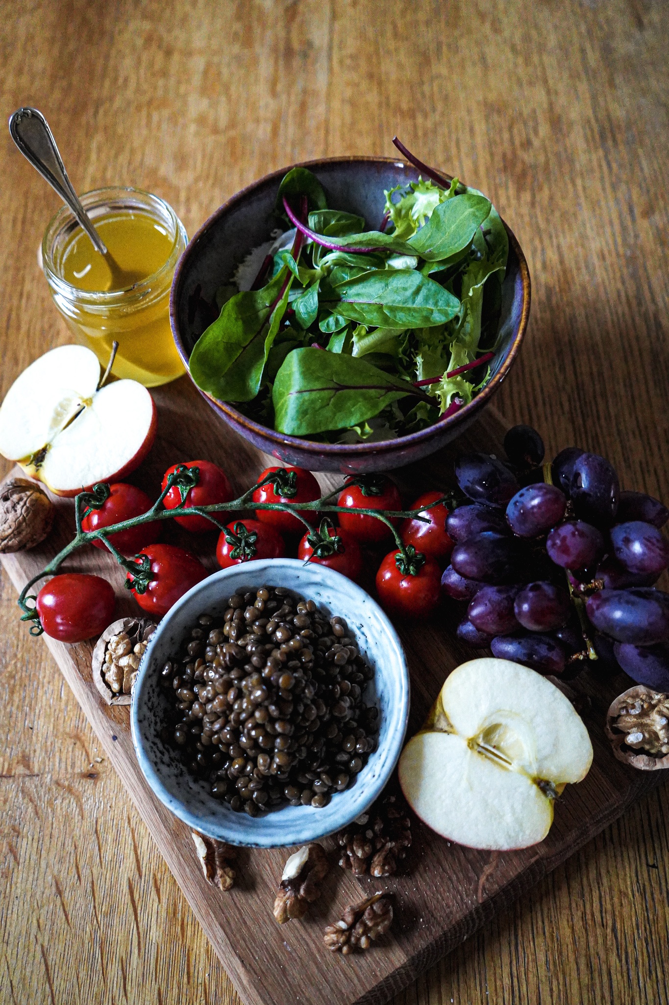 Ich weiß noch, wie uns eine Freundin meiner Mutter dieses Rezept servierte. Wir besuchten sie damals in New York und alles, was sie tat und kannte war stilsicher. Ich jedoch war Teenager und dachte: „Ein Salat mit Äpfeln und Trauben – was soll das denn?“ Zwei Happen später waren meine Vorurteile gegessen. Inzwischen habe ich dieses Gericht hundertmal nachgemacht. Mit der Zugabe von Linsen sättigt es noch mehr. Kompliziert ist es auch nicht. Die Hülsenfrüchte kaufe ich vorgekocht, denn so gelingen meine Rezepte noch schneller. Das Honig-Senf-Dressing macht diesen Salat perfekt. Der winterliche Salat eignet sich als Hauptmahlzeit oder Beilage, kann mit Zutaten wie Feta, Mozzarella, Parmesan, gegrilltem Fleisch, Räucherfisch oder Tofu aber auch noch aufgebessert werden.
