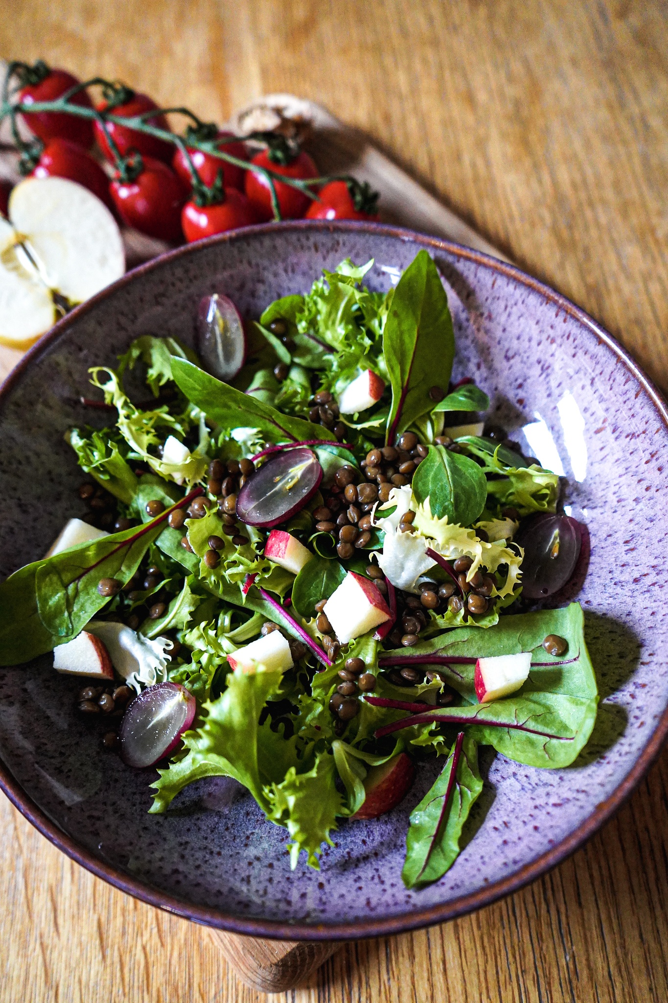 Salat und Obst waschen und putzen. Äpfel halbieren, entkernen, vierteln und in kleine Stücke schneiden. Trauben waschen und längst halbieren. Tomaten waschen und quer halbieren. Das sieht hübscher aus, sagt Flori und ich gebe ihm recht. Die Linsen abspülen und gut abtropfen lassen. Die Salatblätter in einer Schüssel, meine ist von Lonja Living, anrichten. Eine Handvoll Linsen vorsichtig darüber streuen. Den Salat mit den klein geschnittenen Äpfeln, Trauben und Tomaten garnieren. Für das Dressing die oben genannten Zutaten vermischen und abschmecken. Ich mache mein Dressing gerne in einem ausgewaschenem Marmeladen- oder Pastasaucen-Glas, damit sich Senf und Essig besser miteinander verbinden. Laut Rezept kann man auch Schnittlauch hinzufügen. Den gab’s bei uns nicht, also habe ich ihn weggelassen.