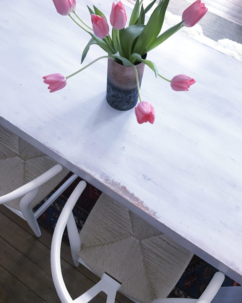 Stuhl: Wishbone Chair, Tisch: Berliner Tische, Schaffelle: Ikea, Vase: House Doctor (gibt’s u.a. hier), Teppich: Vintage (mein Tipp: The Knots)