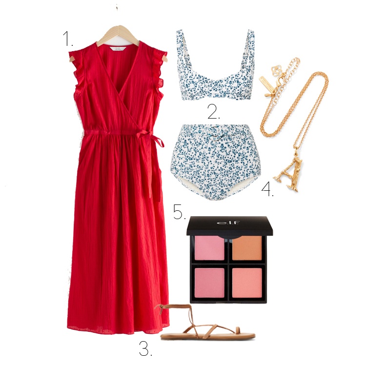 Kleid: & Other Stories, Sandalen: Tkees, Rouge: e.l.f. Cosmetics, Bikini: Peony, Kette: Oscar de la Renta