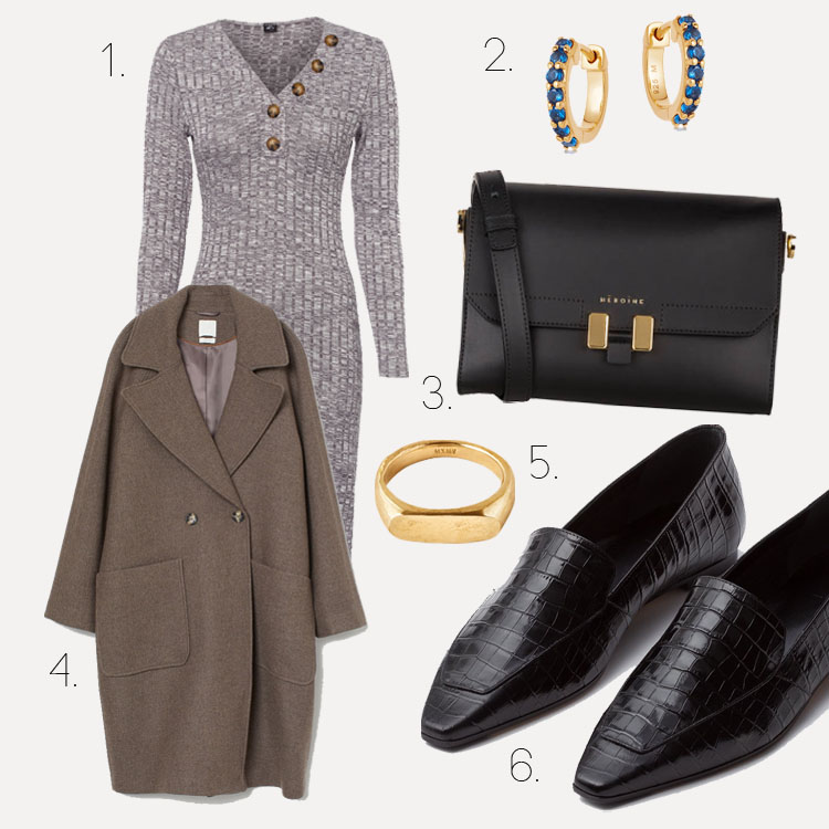 Geripptes Kleid mit Knöpfen: mister*lady, Mantel: H&M Conscious, Ohrringe: Missoma, Tasche: Maison Heroine, Ring: Maximova, Schuhe: Aeyde