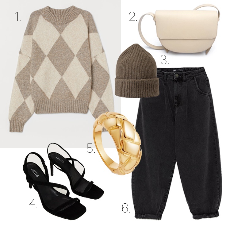 Pullover: H&M & Pringle of Scotland, Slouchy Jeans: Zara, Sandaletten: Edited, Beanie: Le Bonnet via Mili Store, Ring: Missoma x Lucy Williams, weiße Crossybody Bag: Numen