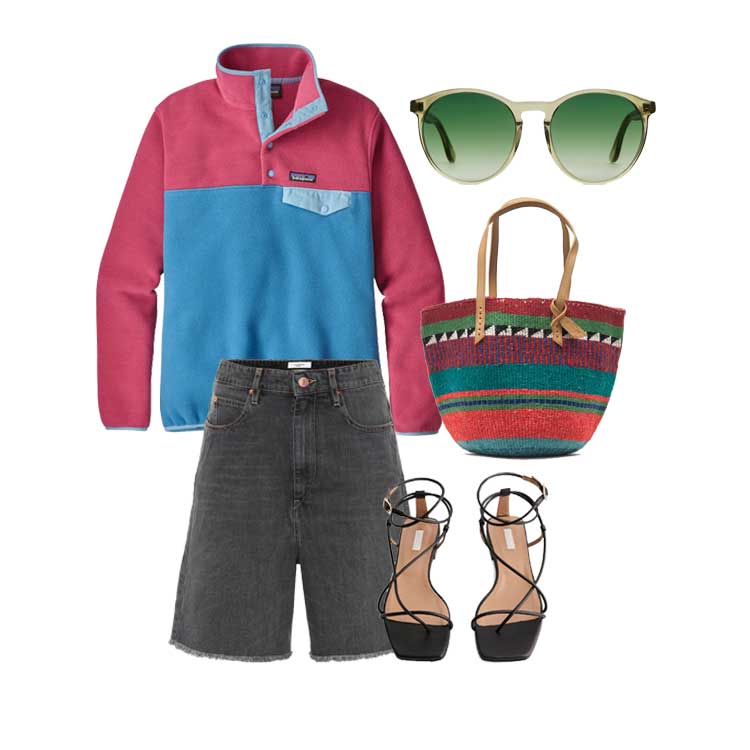 Fleece-Sweater: Patagonia, Jeansshorts: Isabel Marant Étoile, Sonnenbrille: Arket, Tasche: The Basket Room, Sandalen: Arket