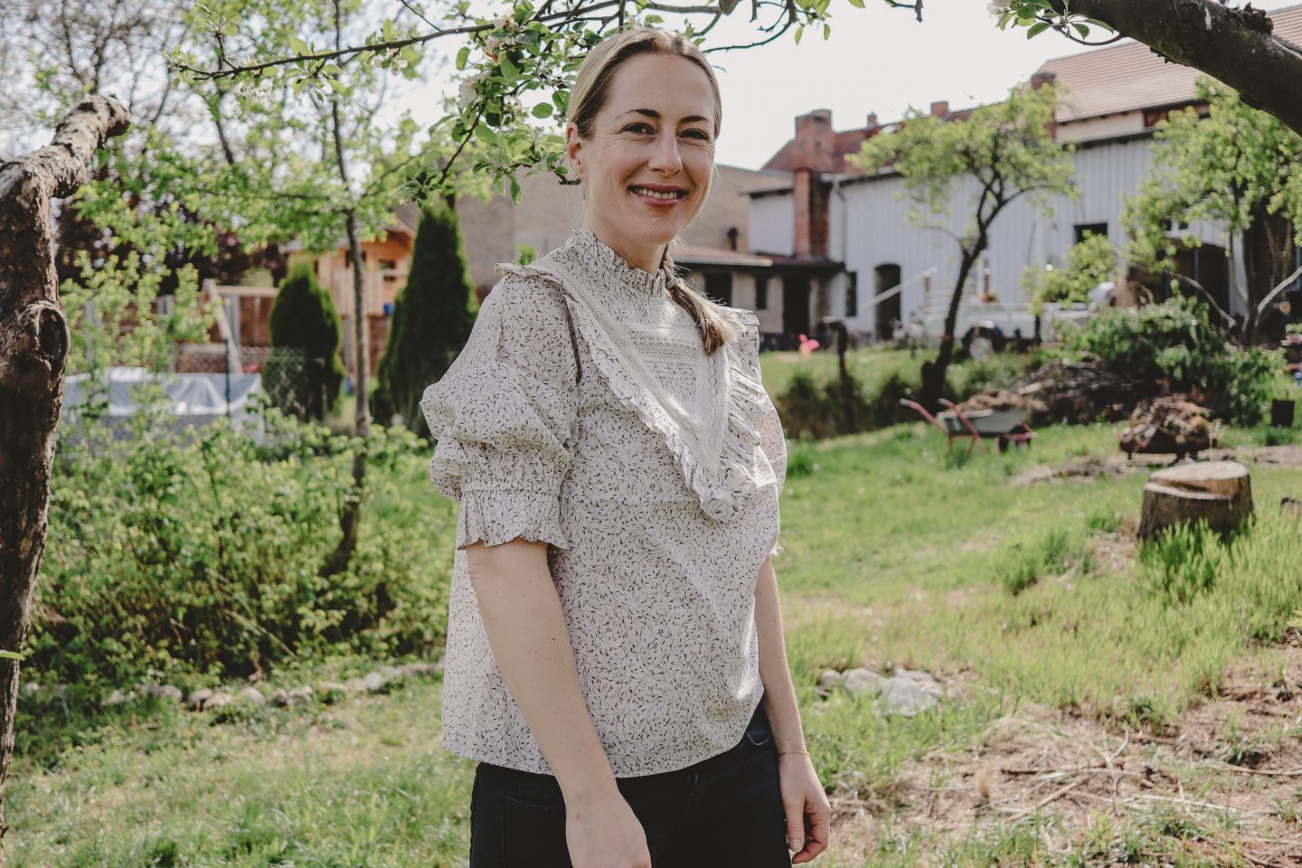 Seitdem ich Mutter bin und wir nicht mehr in der Stadt leben, achte ich übrigens mehr auf Nachhaltigkeit und Umweltschutz. Wir trennen unseren Müll, essen vor allem regional, saisonal, bio oder kaufen direkt beim Bauern. Unsere Eier stammen aus Omas Garten und in Sachen Fleisch versuchen wir eine für die Umwelt möglichst verträgliche Kaufentscheidung zu treffen. Wir fliegen nicht viel, haben nur ein Auto und trinken jetzt beide Hafer- statt Kuhmilch. Die Bluse aus Bio-Baumwollstoff passt super zu meinem neuen Lebensgefühl.