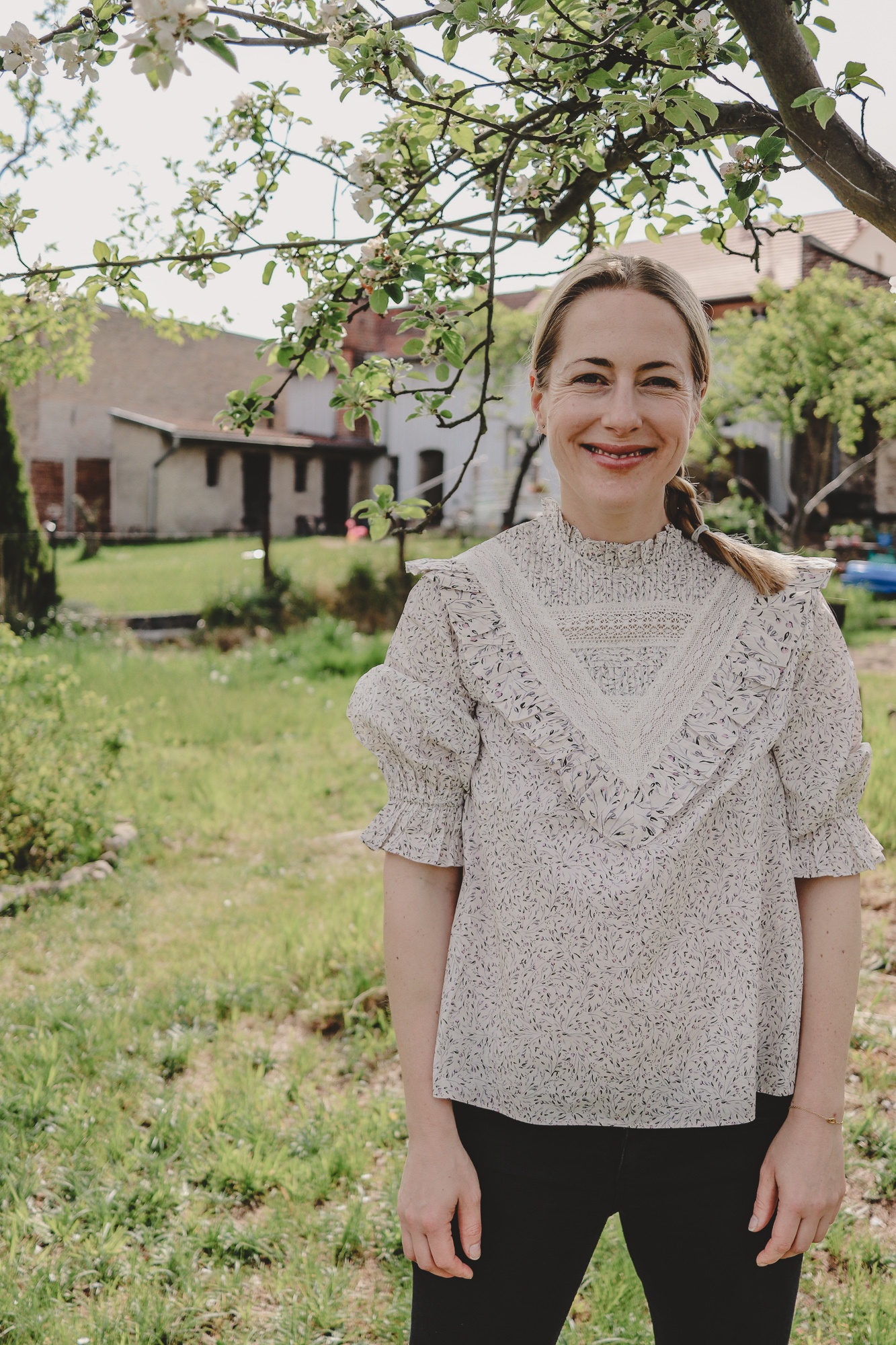 Seitdem ich Mutter bin und wir nicht mehr in der Stadt leben, achte ich übrigens mehr auf Nachhaltigkeit und Umweltschutz. Wir trennen unseren Müll, essen vor allem regional, saisonal, bio oder kaufen direkt beim Bauern. Unsere Eier stammen aus Omas Garten und in Sachen Fleisch versuchen wir eine für die Umwelt möglichst verträgliche Kaufentscheidung zu treffen. Wir fliegen nicht viel, haben nur ein Auto und trinken jetzt beide Hafer- statt Kuhmilch. Die Bluse aus Bio-Baumwollstoff passt super zu meinem neuen Lebensgefühl.