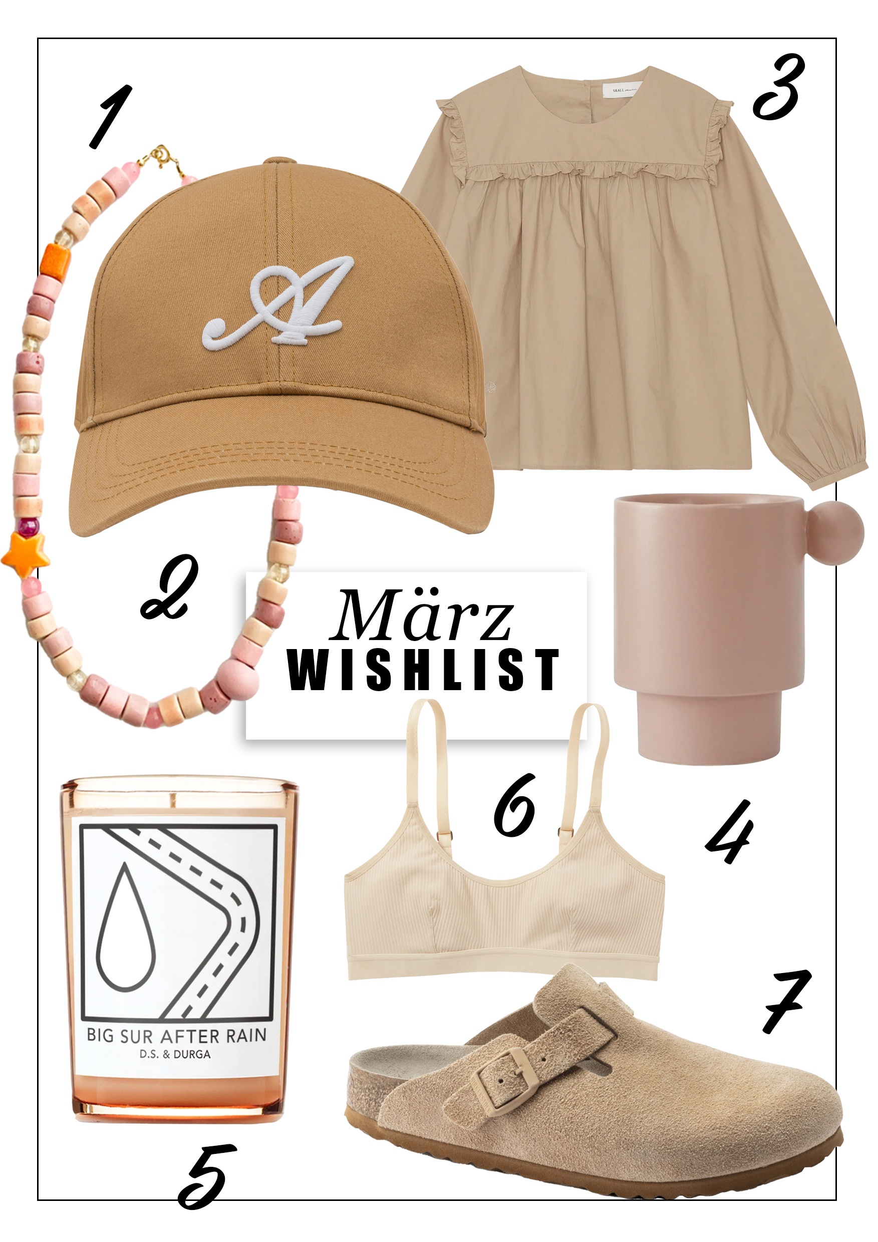 1. Kappe: Axel Arigato, 2. Kette: You are loved, 3. Bluse: Skall Studio, 4. Tasse: Oyoyo Living, 5. Kerze: D.S. & Druga, 6. Bralette: Closely, 7. Schuhe: Boston von Birkenstock