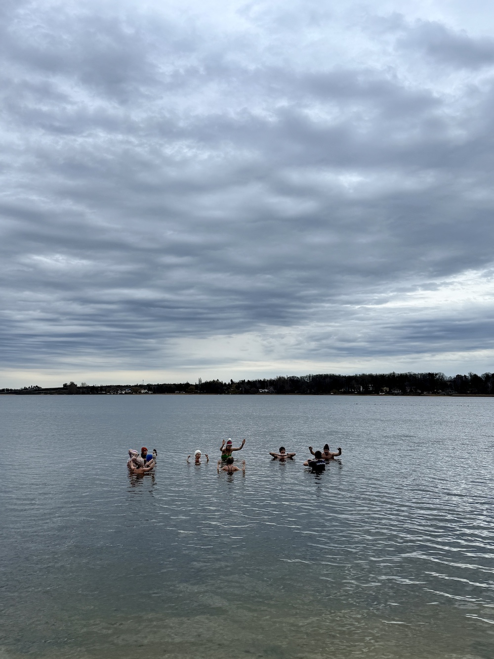 - Zügig ins Wasser gehen, dann hinhocken und die Muskulatur entspannen. Arme aus dem Wasser halten, Schultern nach unten ziehen. Wir hatten alle eine Mütze auf dem Kopf, viele trugen Neopren- und Handschuhe.