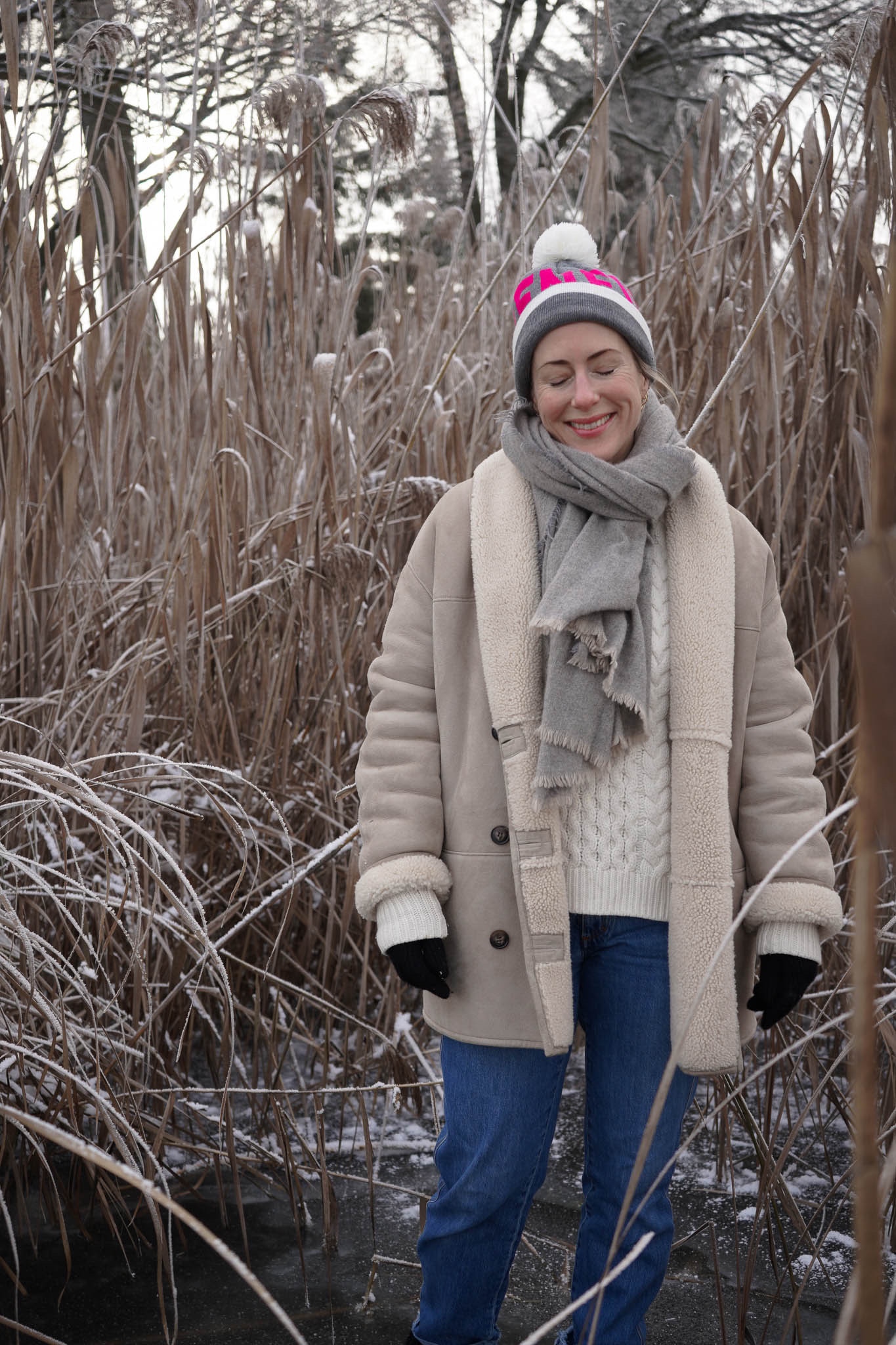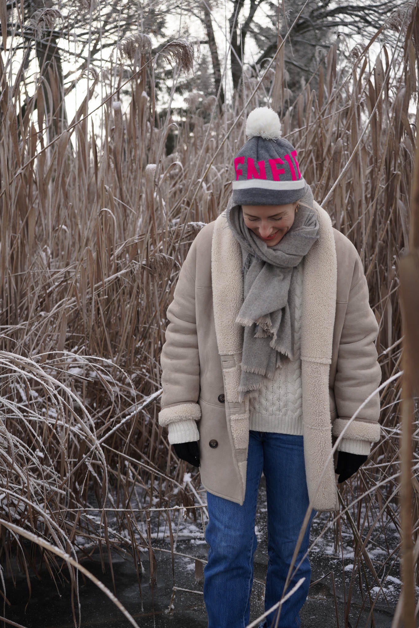 Mütze: Penfield (alt), Lammfelljacke und Pullover: Loulou Studio, Schal: Anfenger, Jeans: Closed Pedal Pusher, Schuhe: Sorel Explorer Boots, Handschuhe: Arket